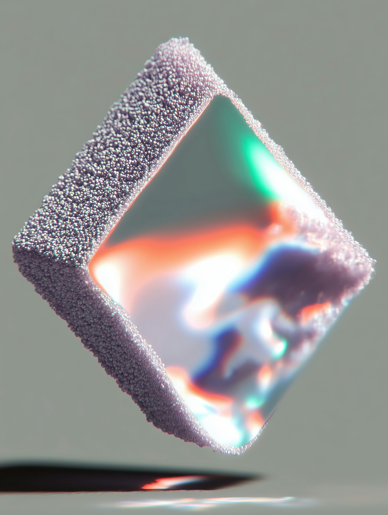 A futuristic 3D-rendered diamond-shaped object with a textured surface and iridescent core, floating against a neutral gray background.