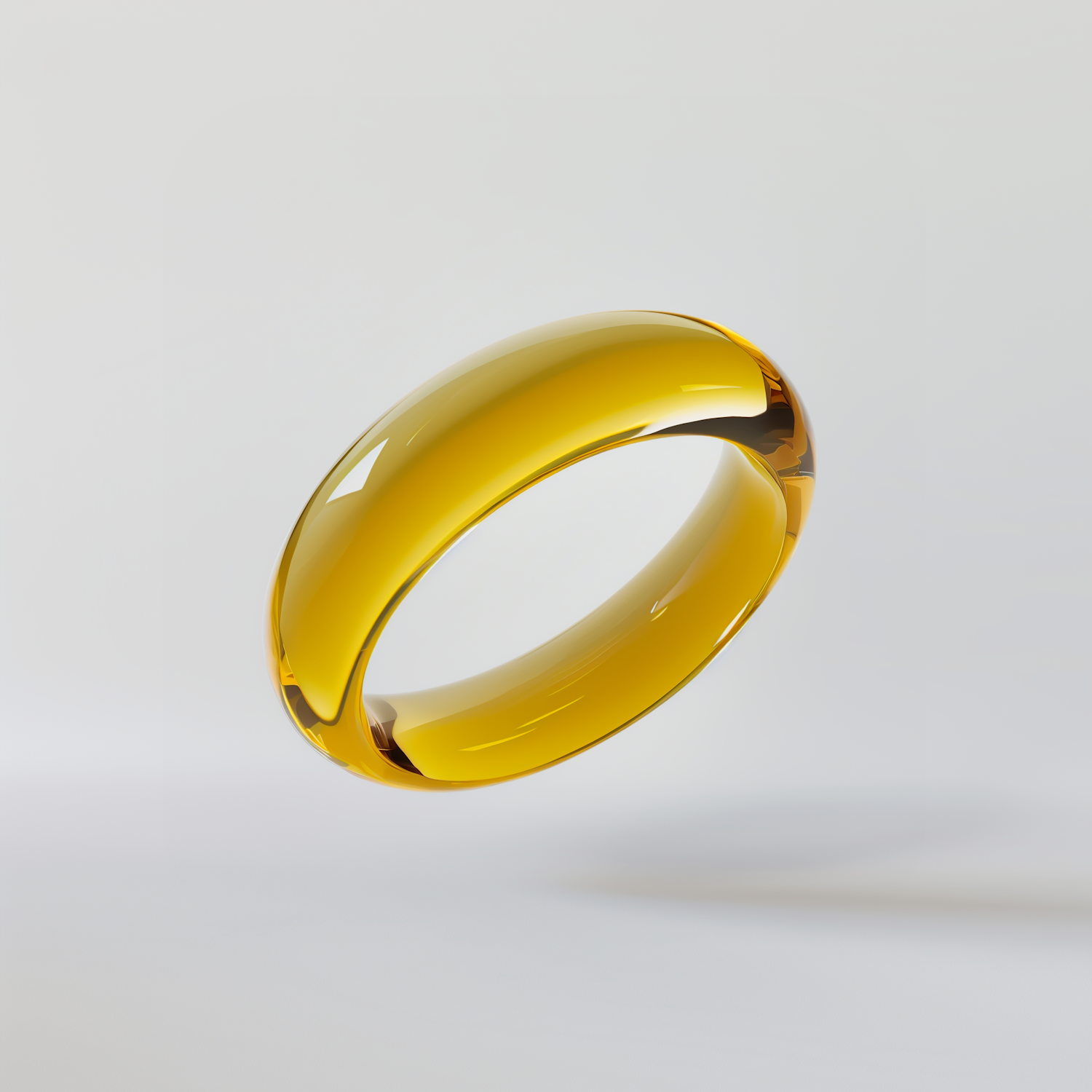 A glossy golden ring floating against a light gray background, showcasing elegance and luxury with its smooth, reflective surface.