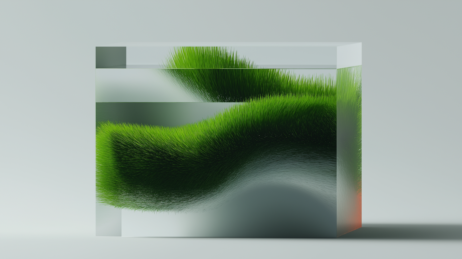 A 3D-rendered transparent block with floating green grass textures, creating a surreal and artistic visual effect.