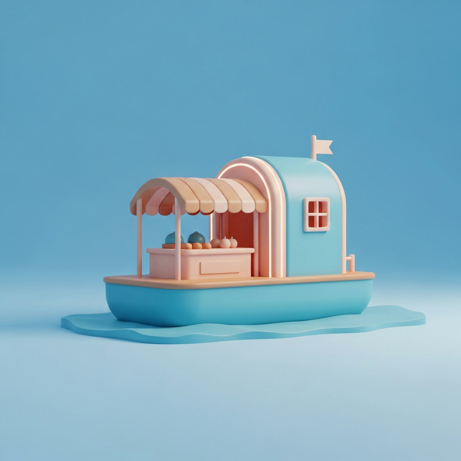 A whimsical 3D-rendered floating market boat with pastel colors and a minimalistic design against a light blue background.