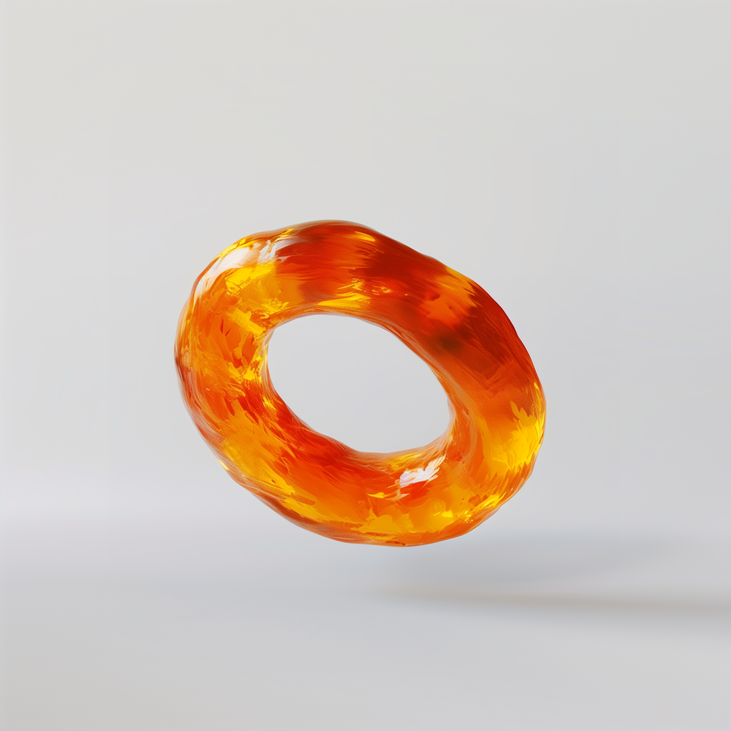 A glossy, translucent orange torus with a liquid-like texture floats against a soft gray background.