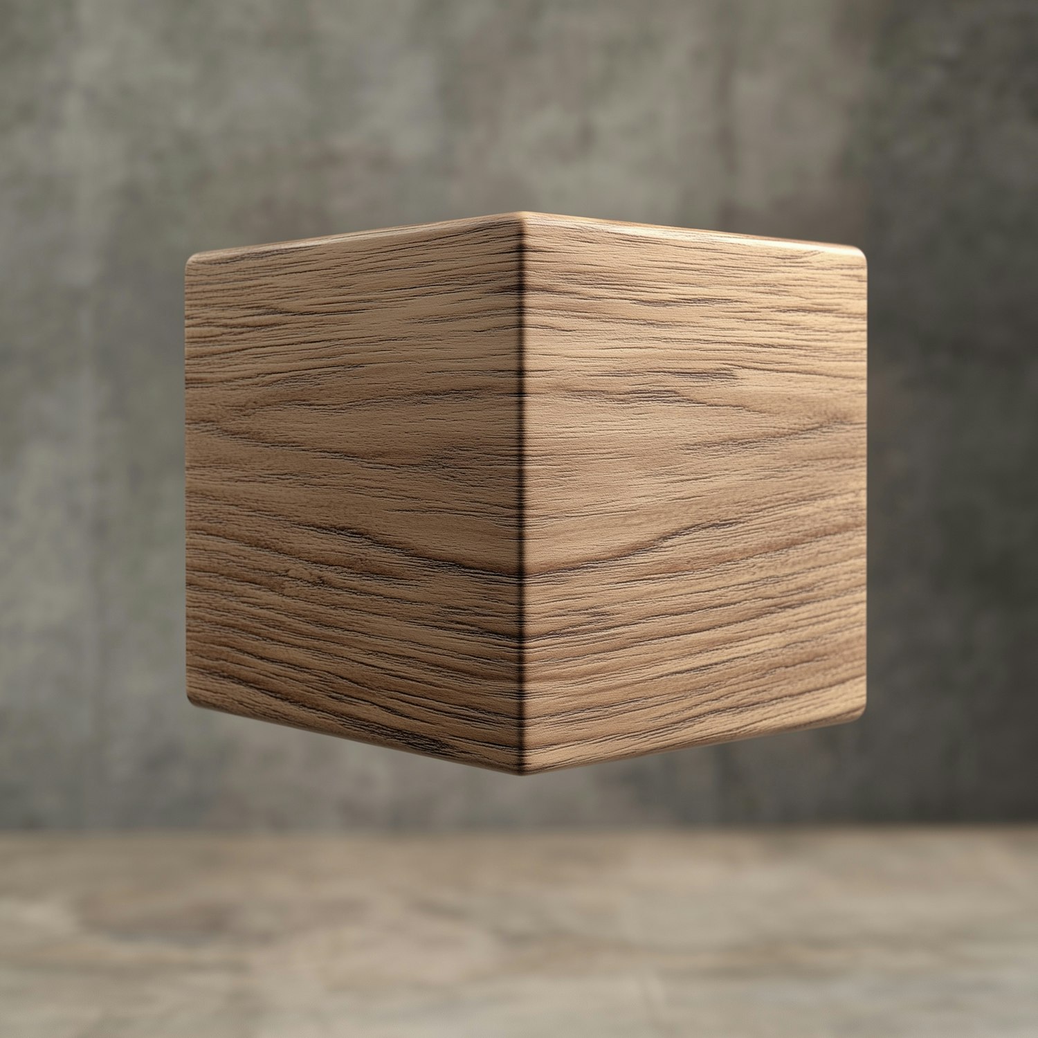 A polished wooden cube with natural grain texture floats against a blurred concrete background, showcasing its smooth and organic design.