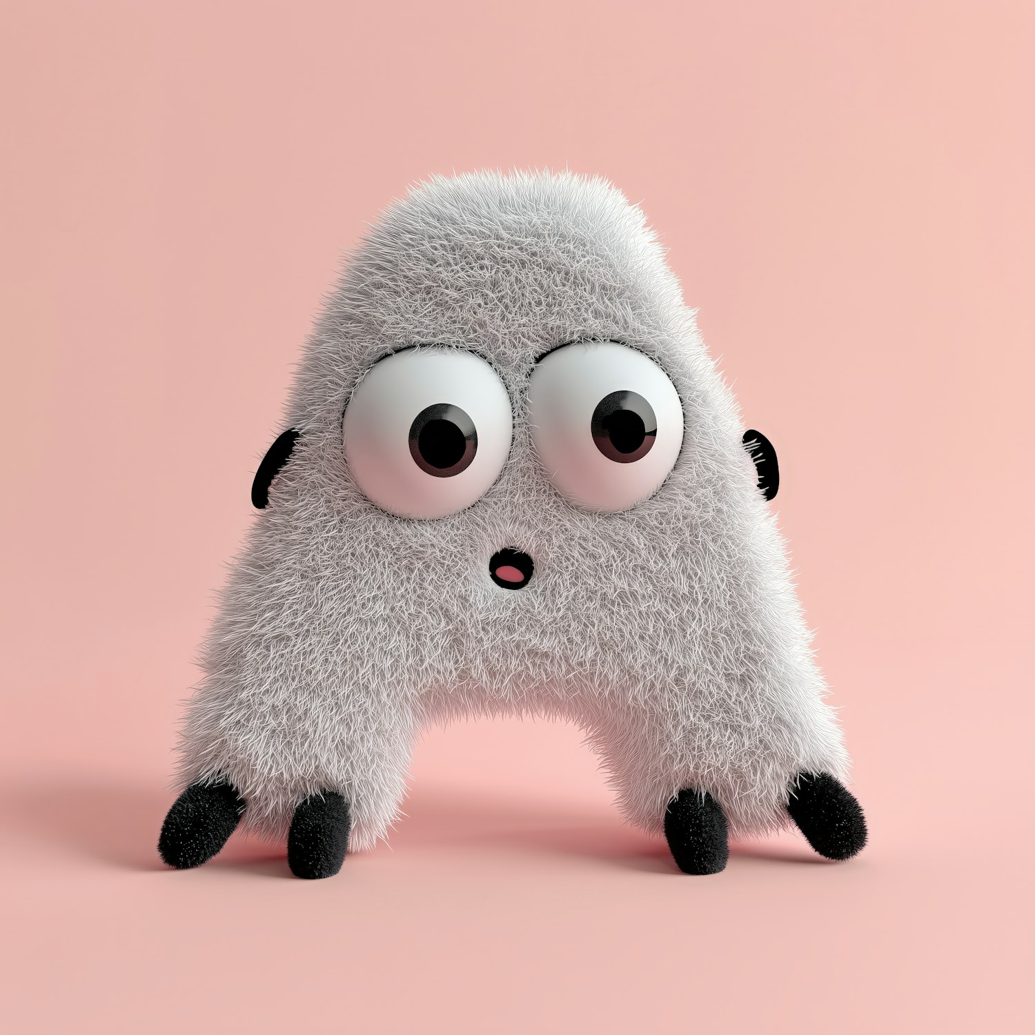 Adorable fluffy A-shaped character with big eyes and a surprised look, set against a pastel pink background. Perfect for playful designs.
