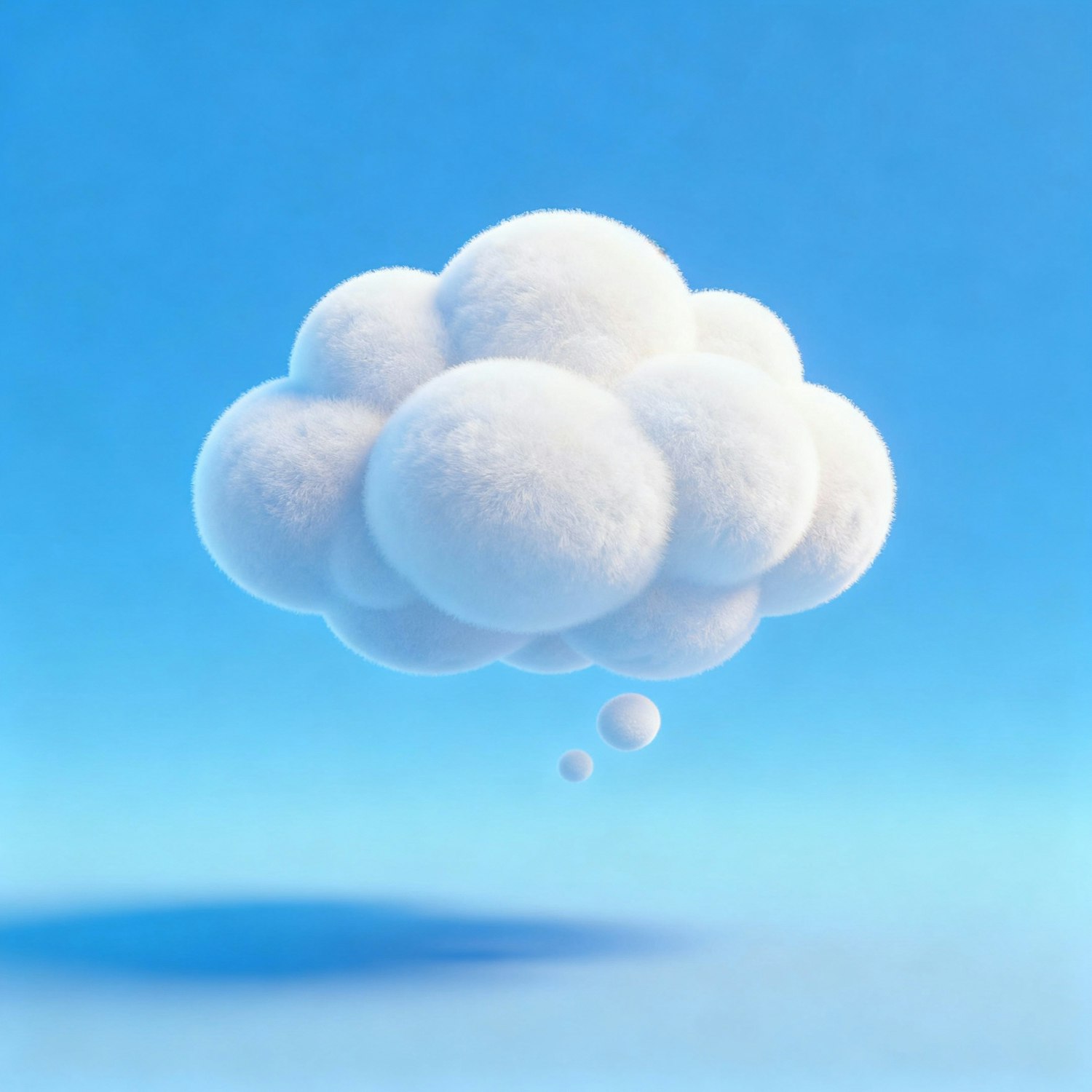 A fluffy, spherical cloud floats in a clear blue sky, creating a serene and minimalistic visual with soft textures and gentle shadows.
