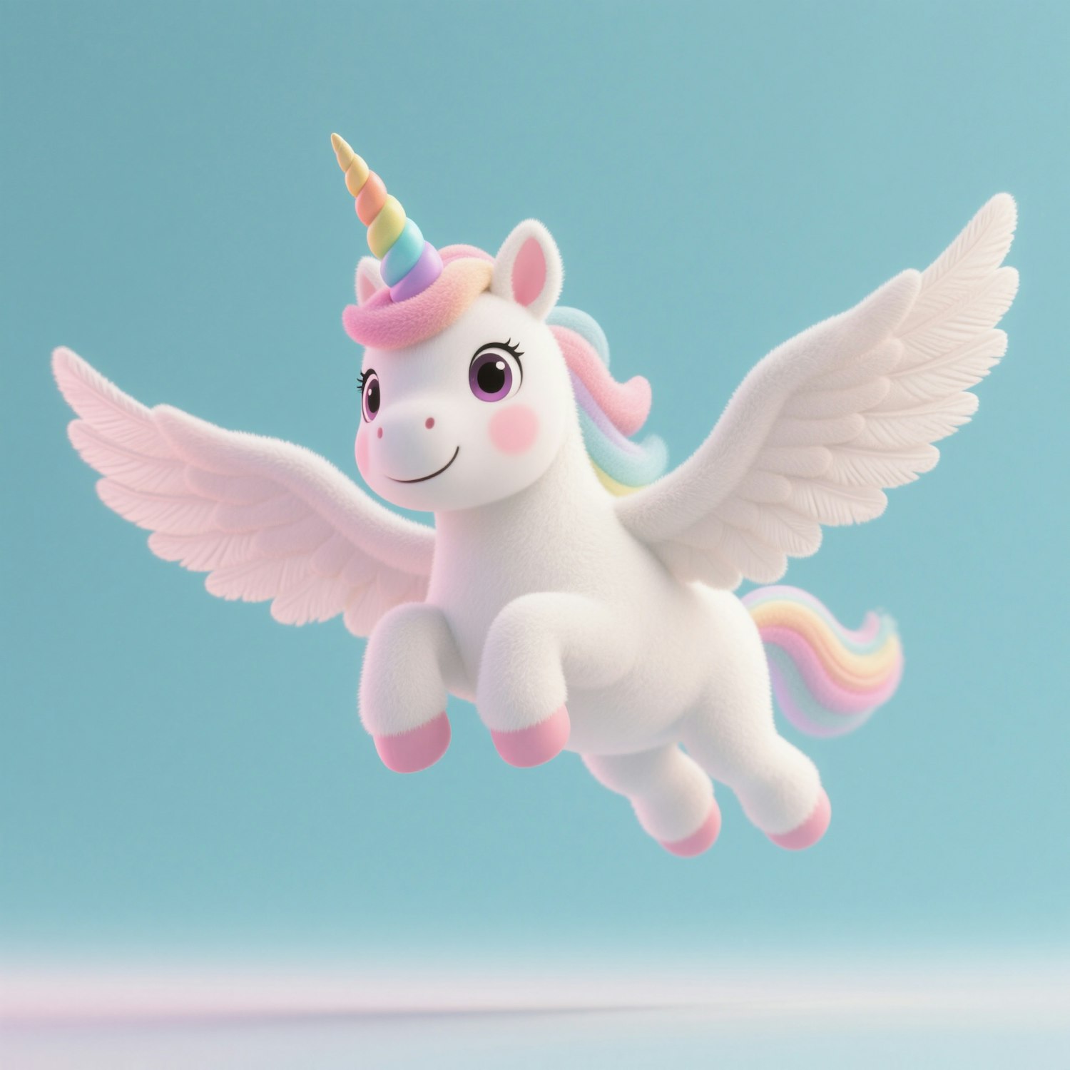 3D Soft Unicorn with single rainbow colored horn flying with large open wings, soft, toony, character, cyan background, soft render, clean render, smooth render