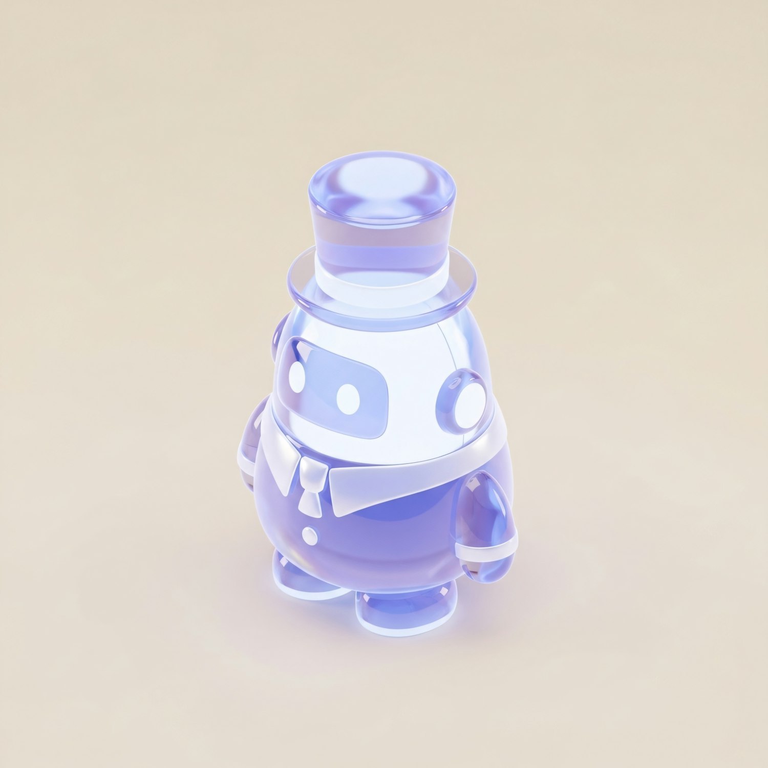 A 3D-rendered robot in a formal outfit with a top hat, featuring a glossy blue and white design on a neutral beige background.