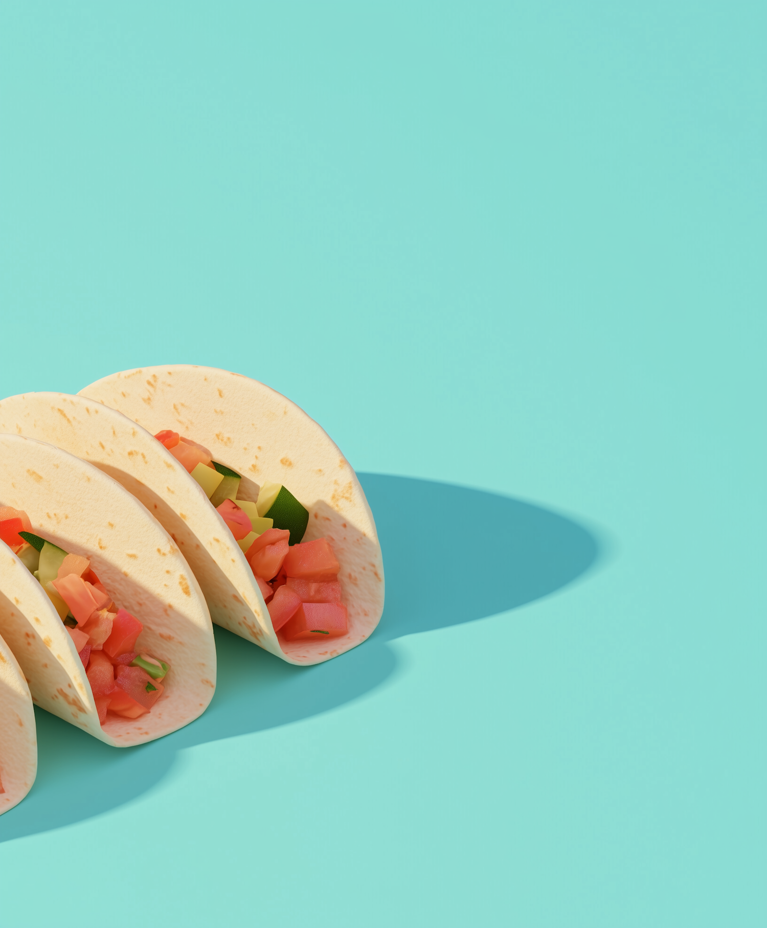 Three soft tacos filled with fresh diced vegetables on a turquoise background, creating a vibrant and appetizing scene.