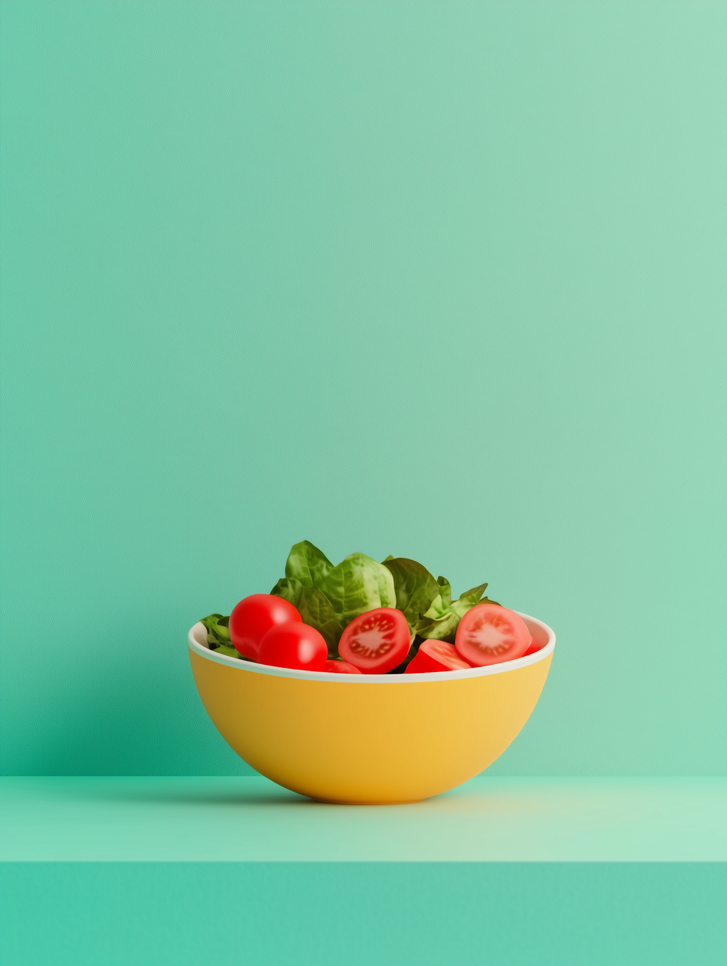 Bright yellow bowl with fresh lettuce and cherry tomatoes on a mint green background, creating a vibrant and minimalist aesthetic.