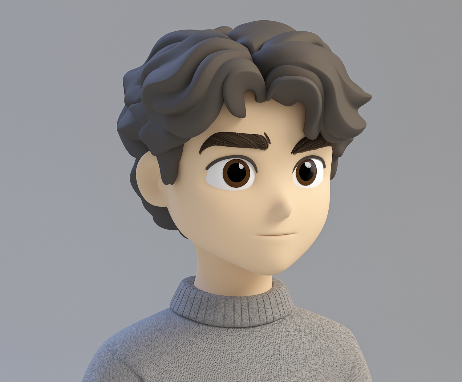 3D illustration of a young character with wavy dark hair and brown eyes, wearing a gray sweater against a muted background.