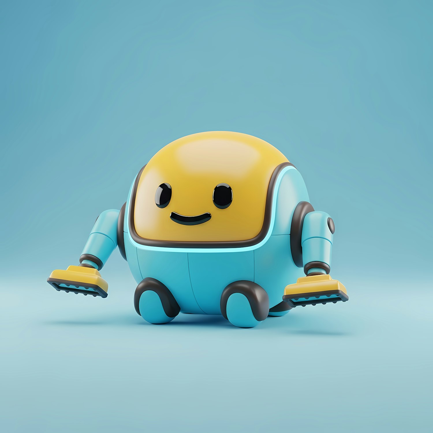 Adorable cartoon robot with a yellow head and blue body, featuring a friendly smile and tool-like arms, set against a light blue background.