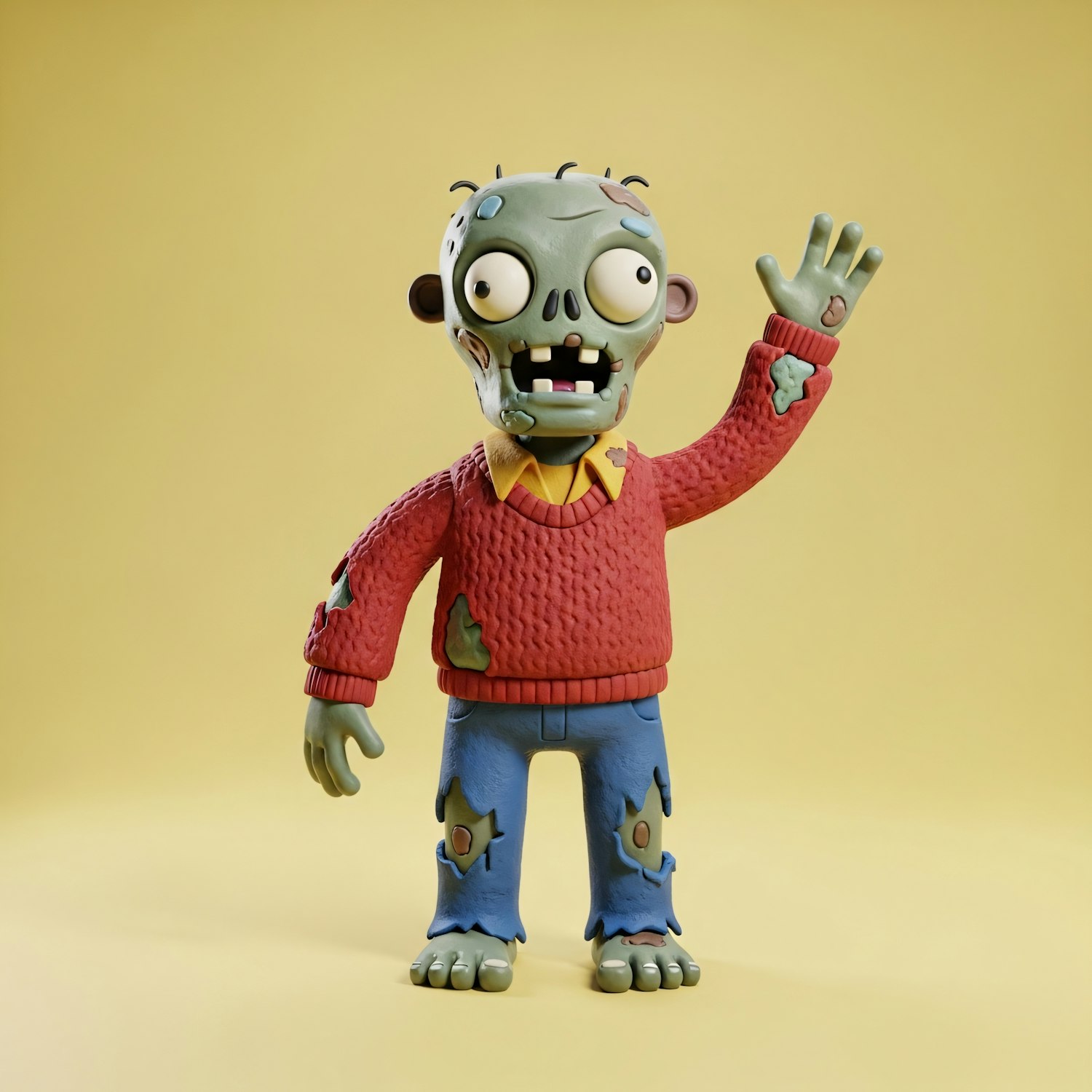 A playful cartoon zombie with green skin, a red sweater, and blue pants waves against a bright yellow background.