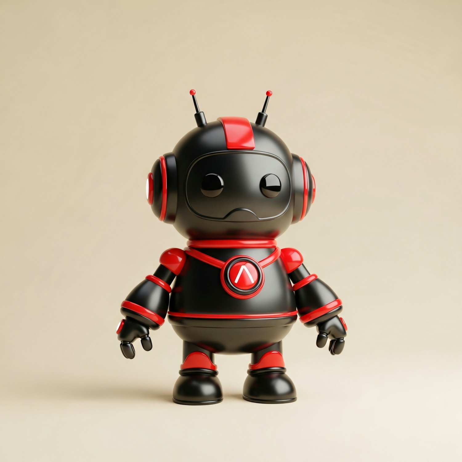 A cute black and red robot with a glossy finish stands on a beige background, showcasing a modern and playful design.