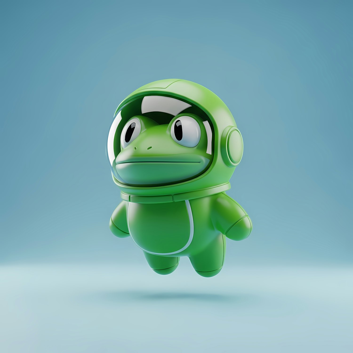 Adorable 3D green frog astronaut character floating in a light blue background, perfect for creative and fun designs.