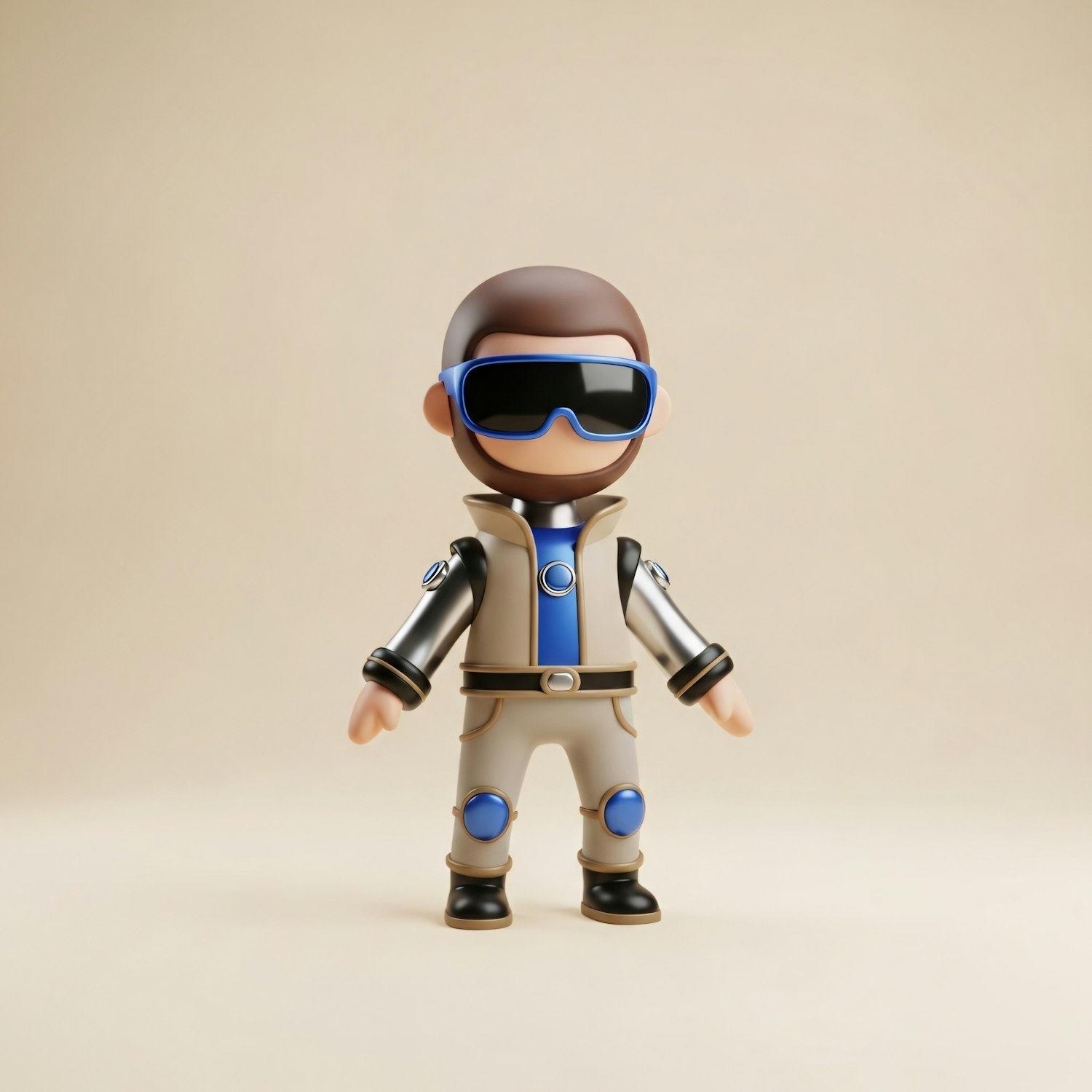 A 3D-rendered futuristic character with a sleek outfit and reflective goggles, set against a neutral background.