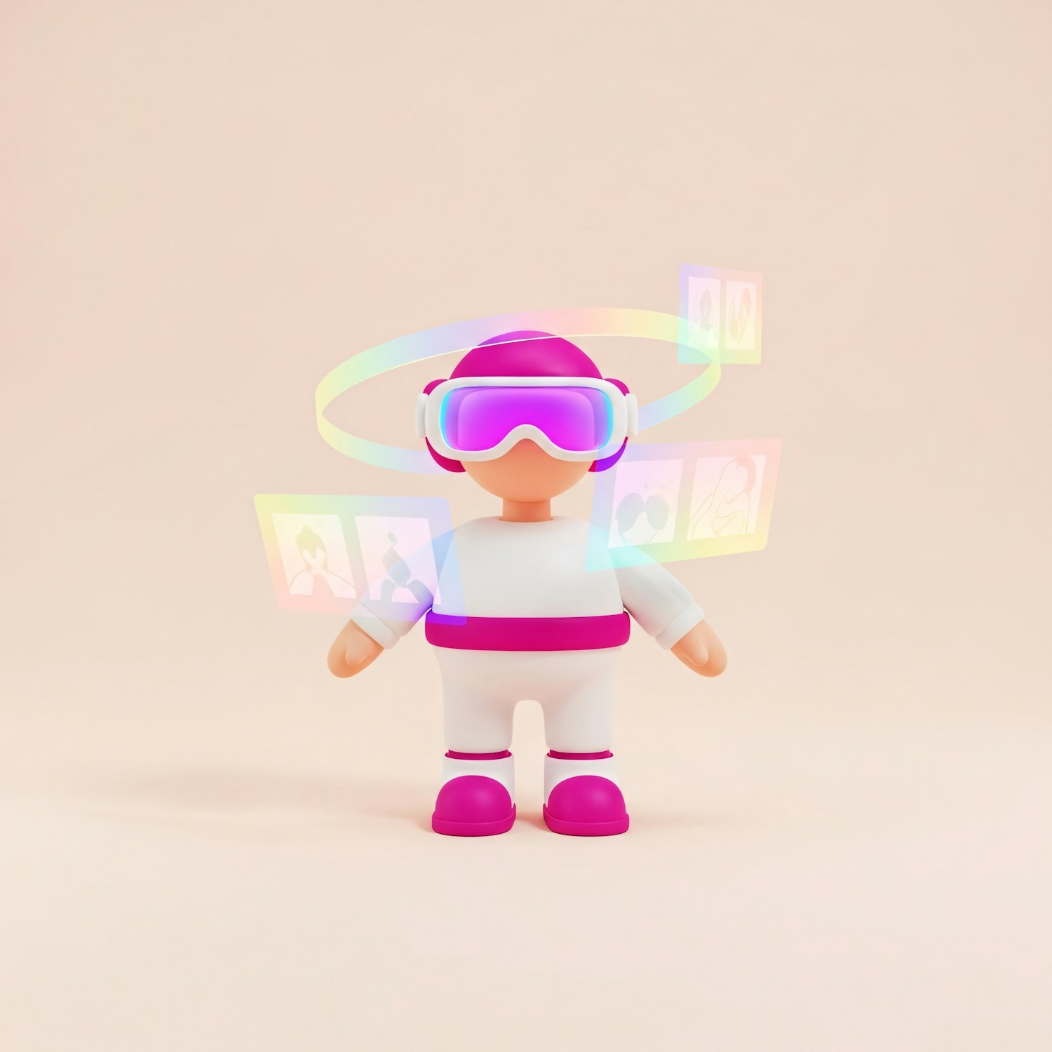 A 3D-rendered character in a futuristic outfit interacts with holographic panels, set against a soft pastel background.