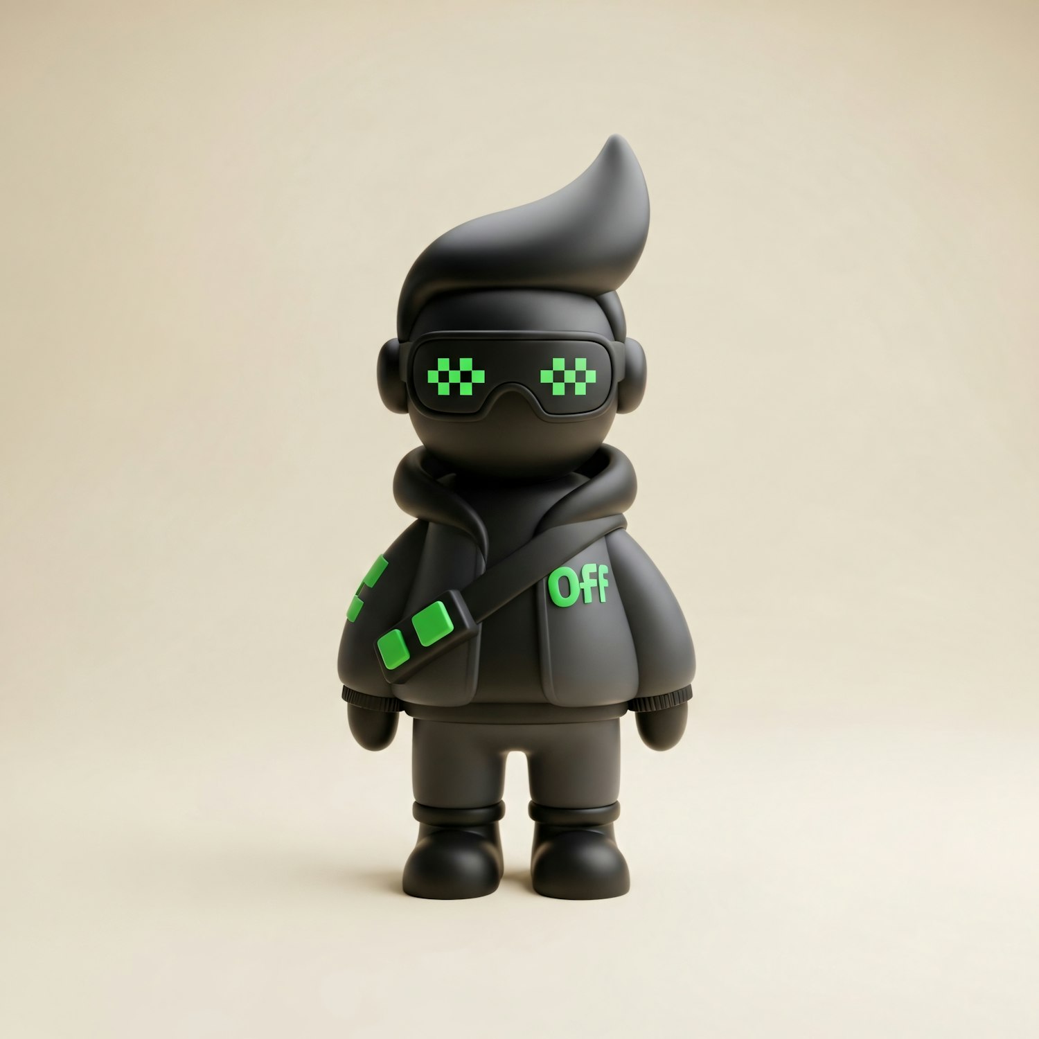 A sleek 3D character with a black and green futuristic design, featuring pixelated goggles and a stylish outfit.
