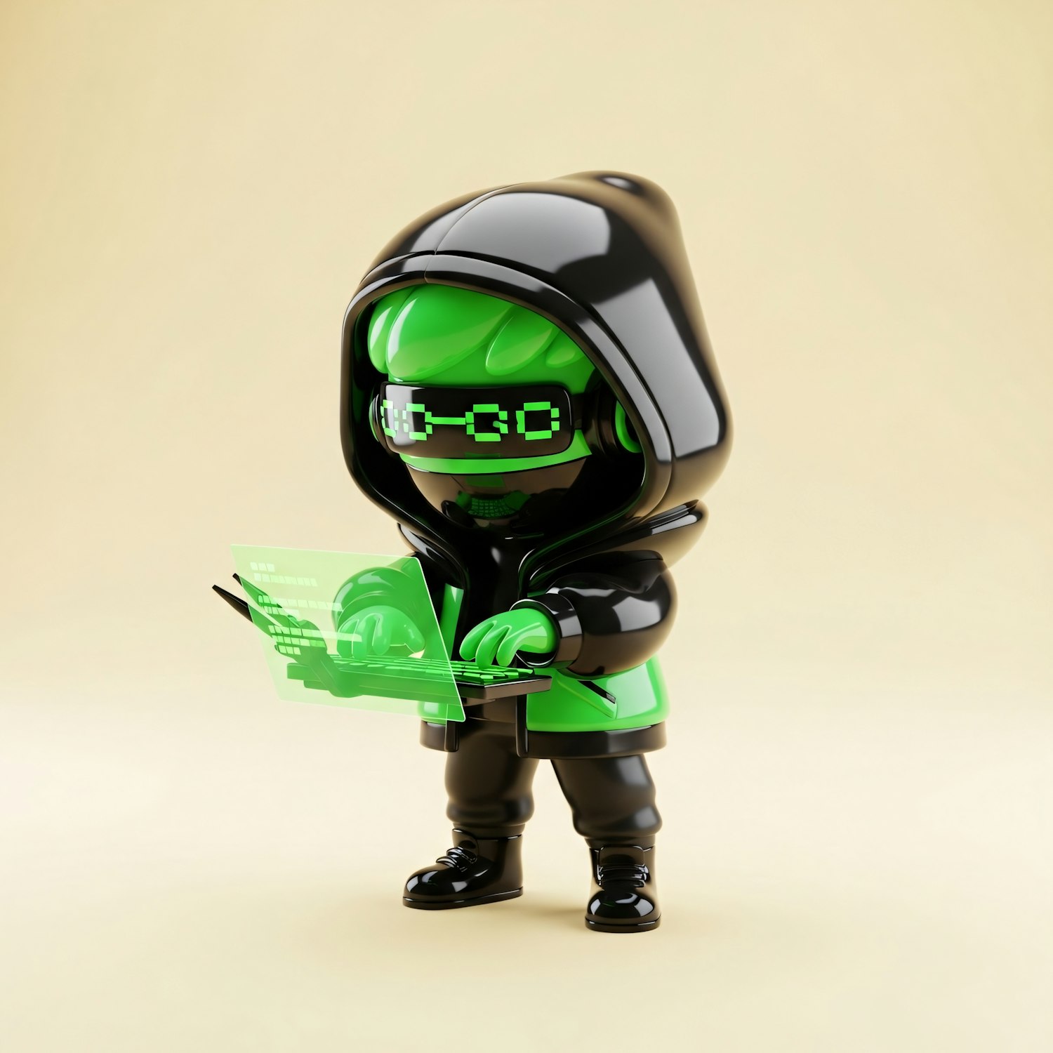 A futuristic 3D character in a black and green outfit interacts with a glowing holographic interface, set against a neutral background.