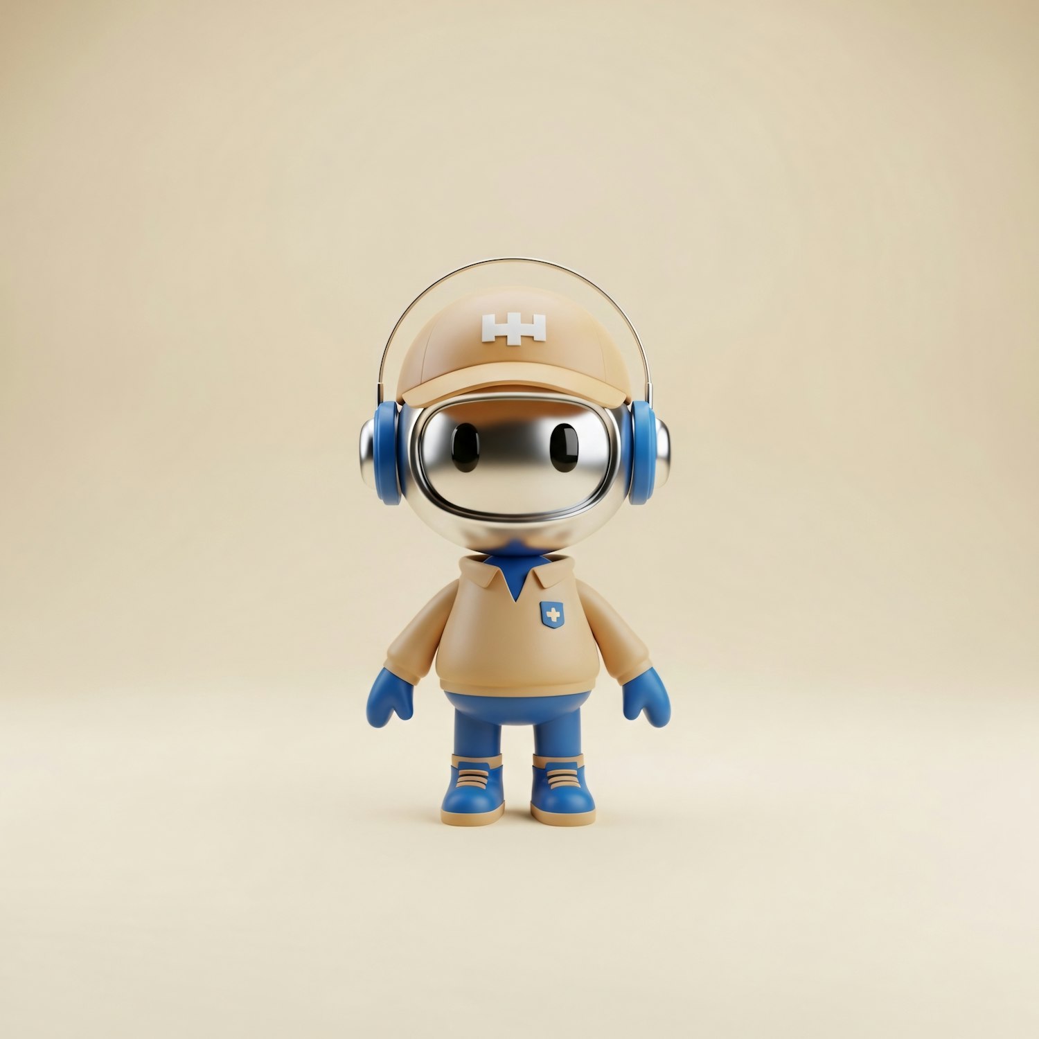 A cute 3D character with a metallic face, beige outfit, and blue accents, standing against a neutral background.