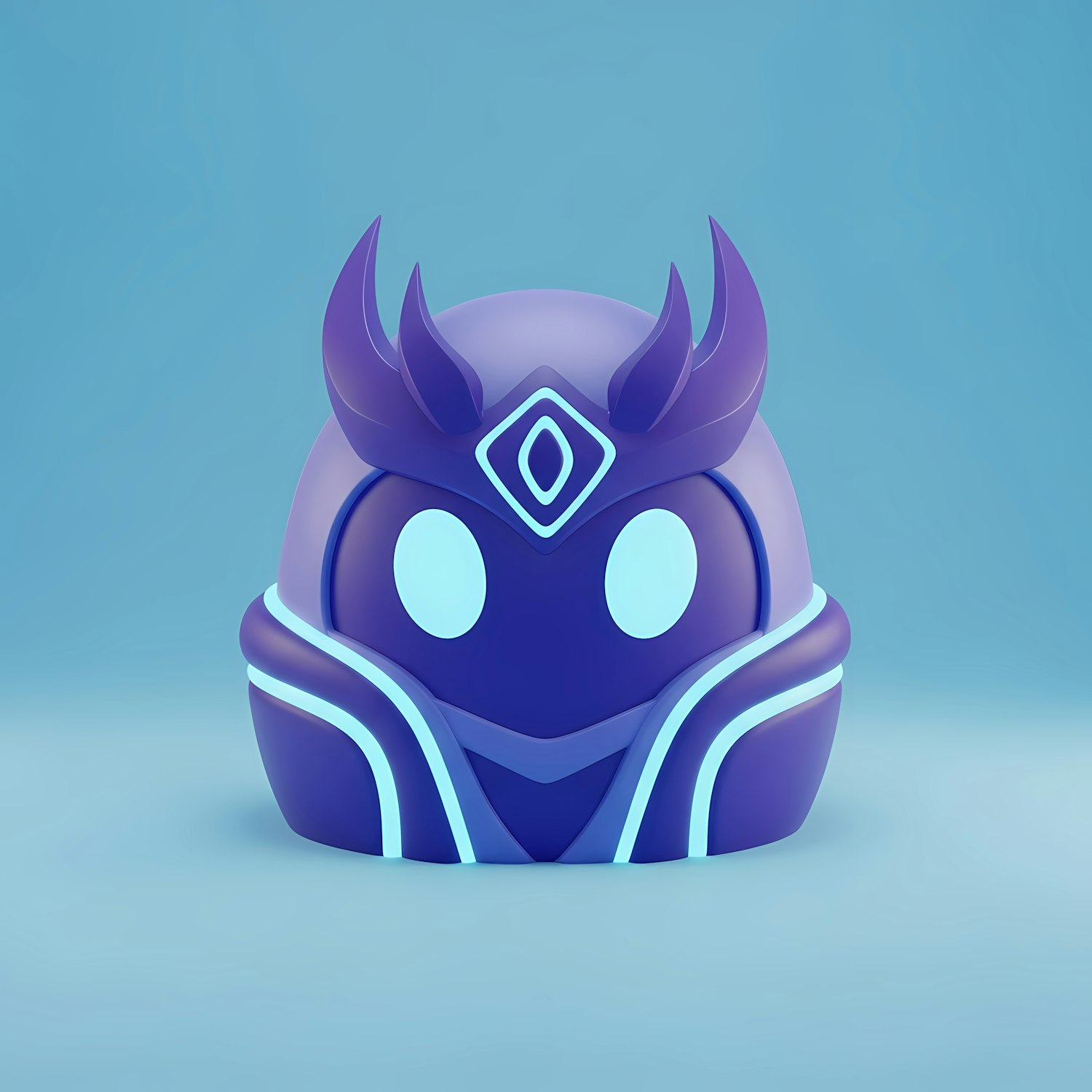 A cute 3D character with a purple and cyan glowing design, featuring a crown-like headpiece and a futuristic aesthetic.