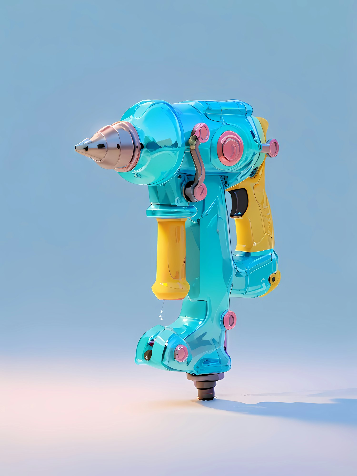 A colorful 3D-rendered futuristic drill with turquoise, yellow, and pink accents, set against a clean blue gradient background.