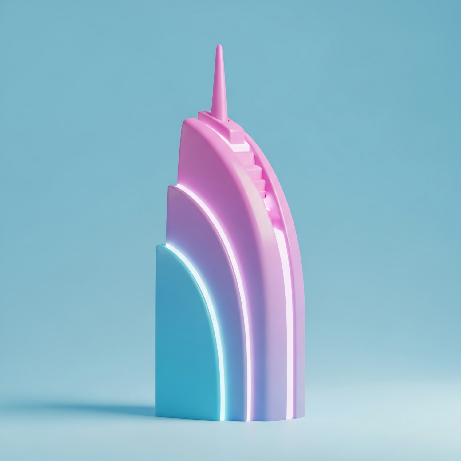 A pastel pink and blue 3D-rendered structure with glowing accents, set against a light blue background, showcasing modern design.