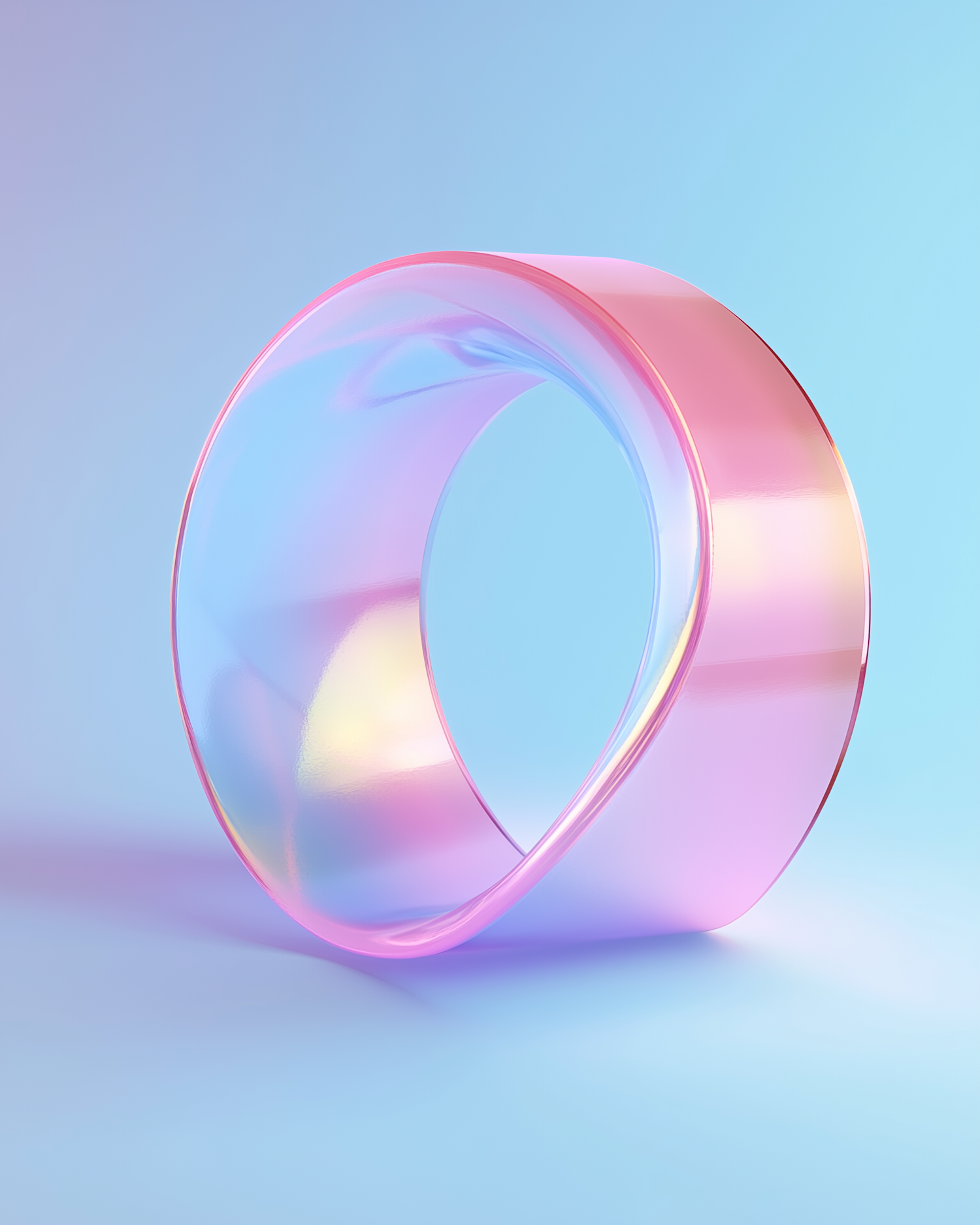 A glossy, pastel-hued 3D torus with reflective and translucent textures, set against a soft gradient background of blue and pink.
