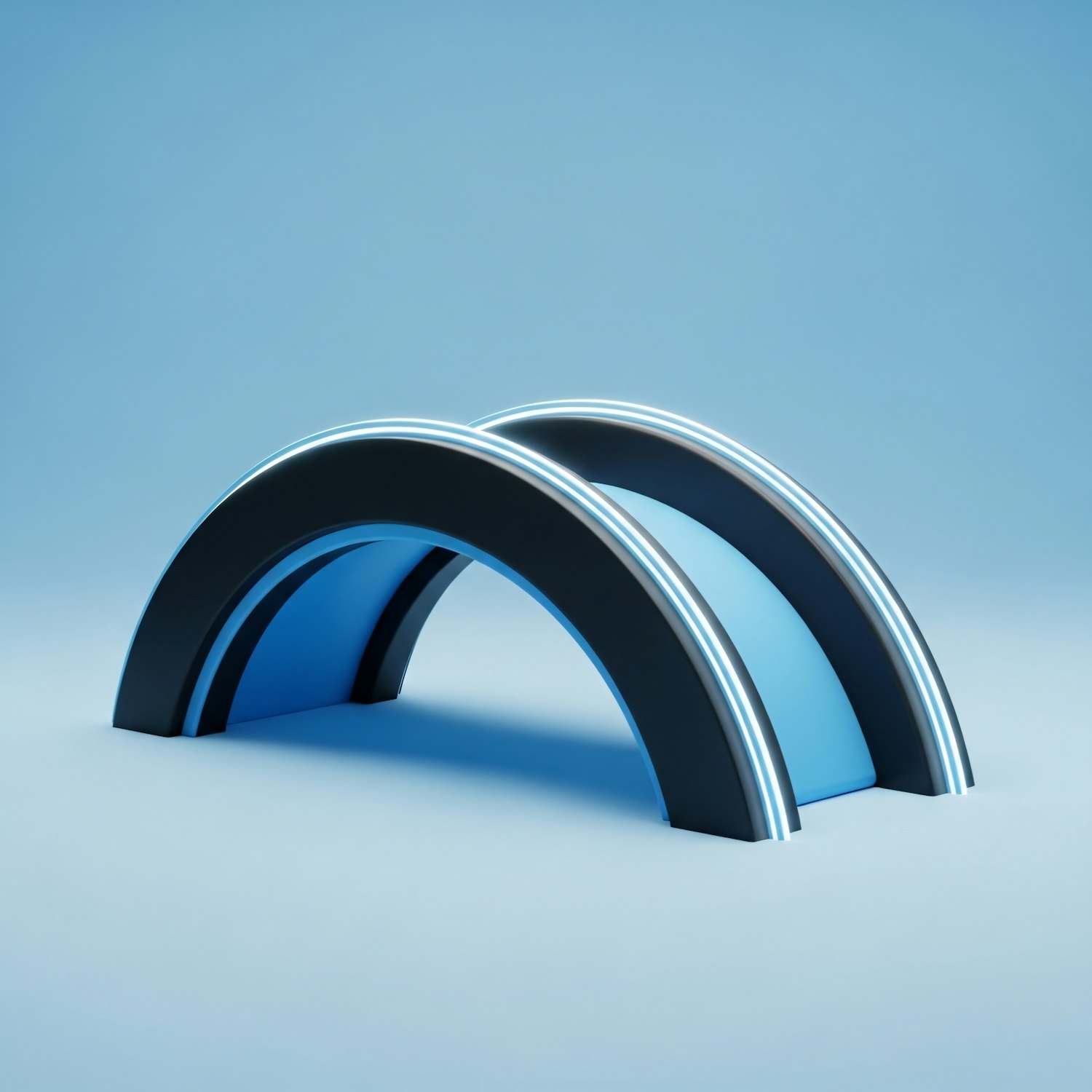 A sleek 3D rendering of glowing black and blue arches on a soft blue background, showcasing a modern and futuristic design.