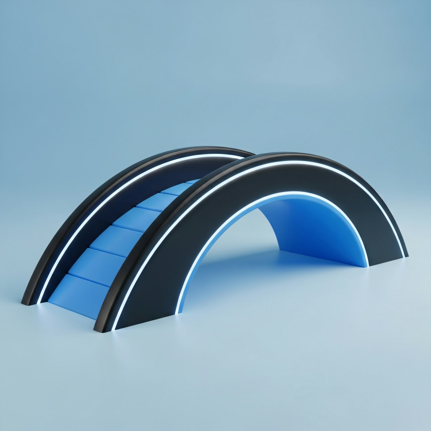 A sleek, modern arched structure with glowing edges and vibrant blue accents, set against a light blue background.