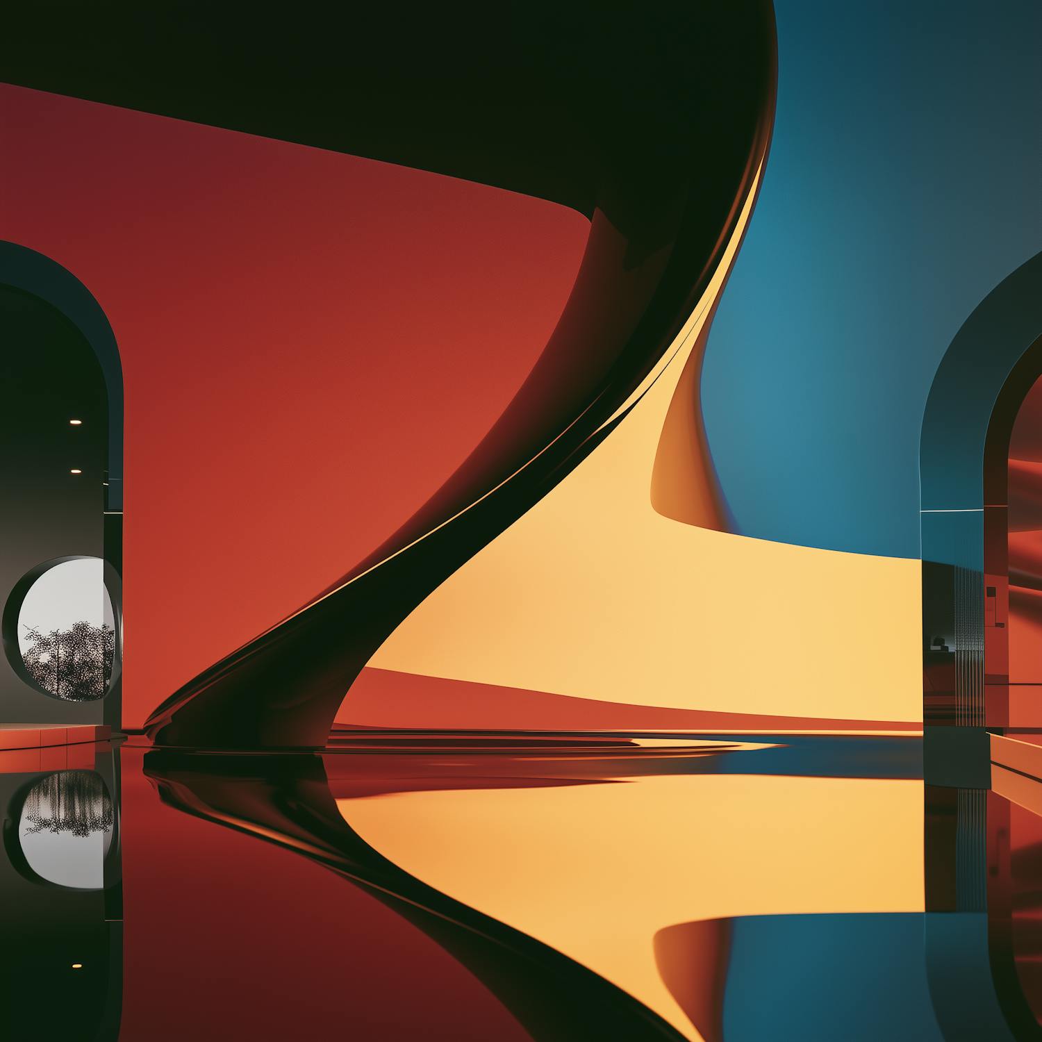 Futuristic interior with bold curves and vibrant colors, featuring red, yellow, and blue elements and a circular window view.