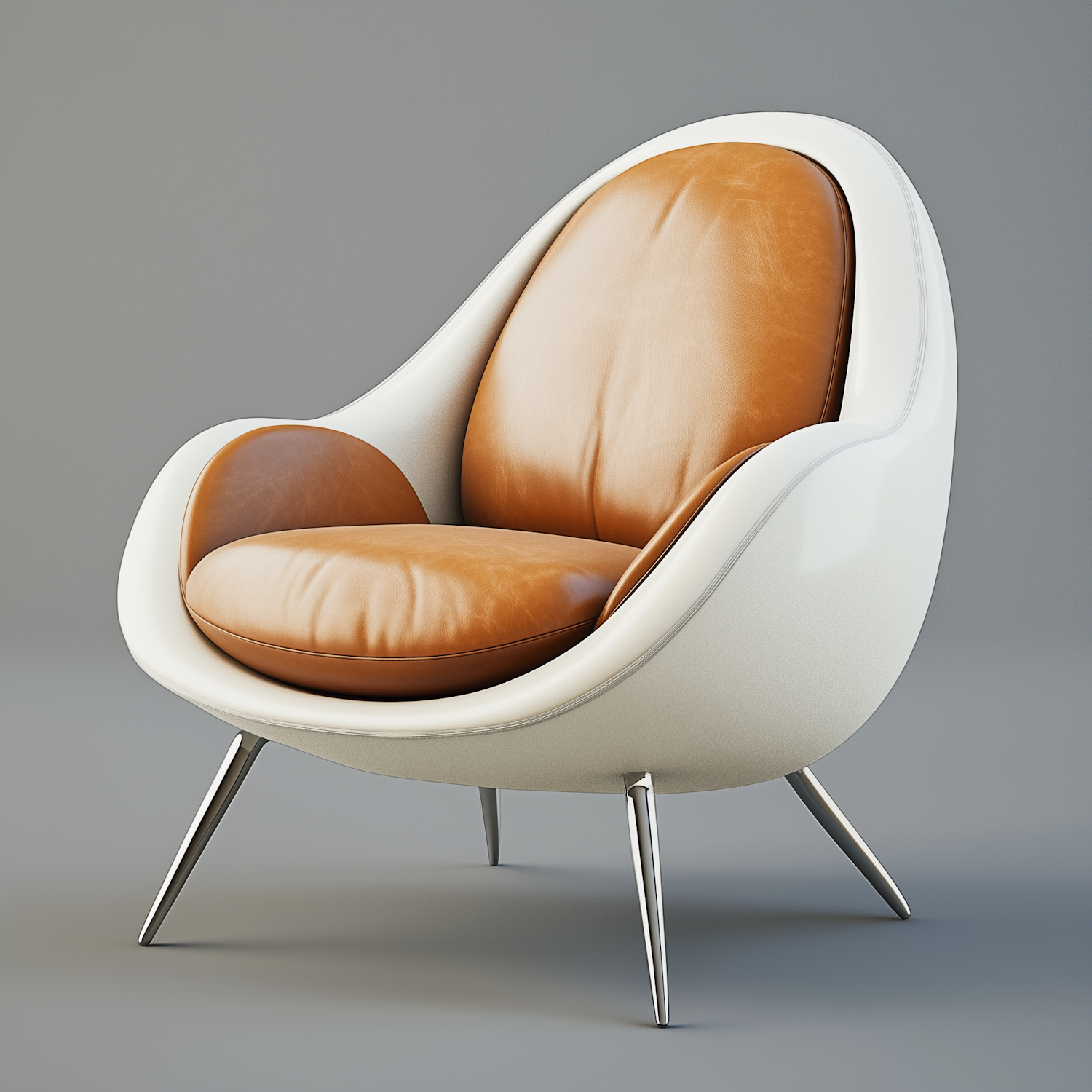Modern armchair with a white shell, caramel leather upholstery, and sleek metallic legs. Perfect for contemporary interiors.