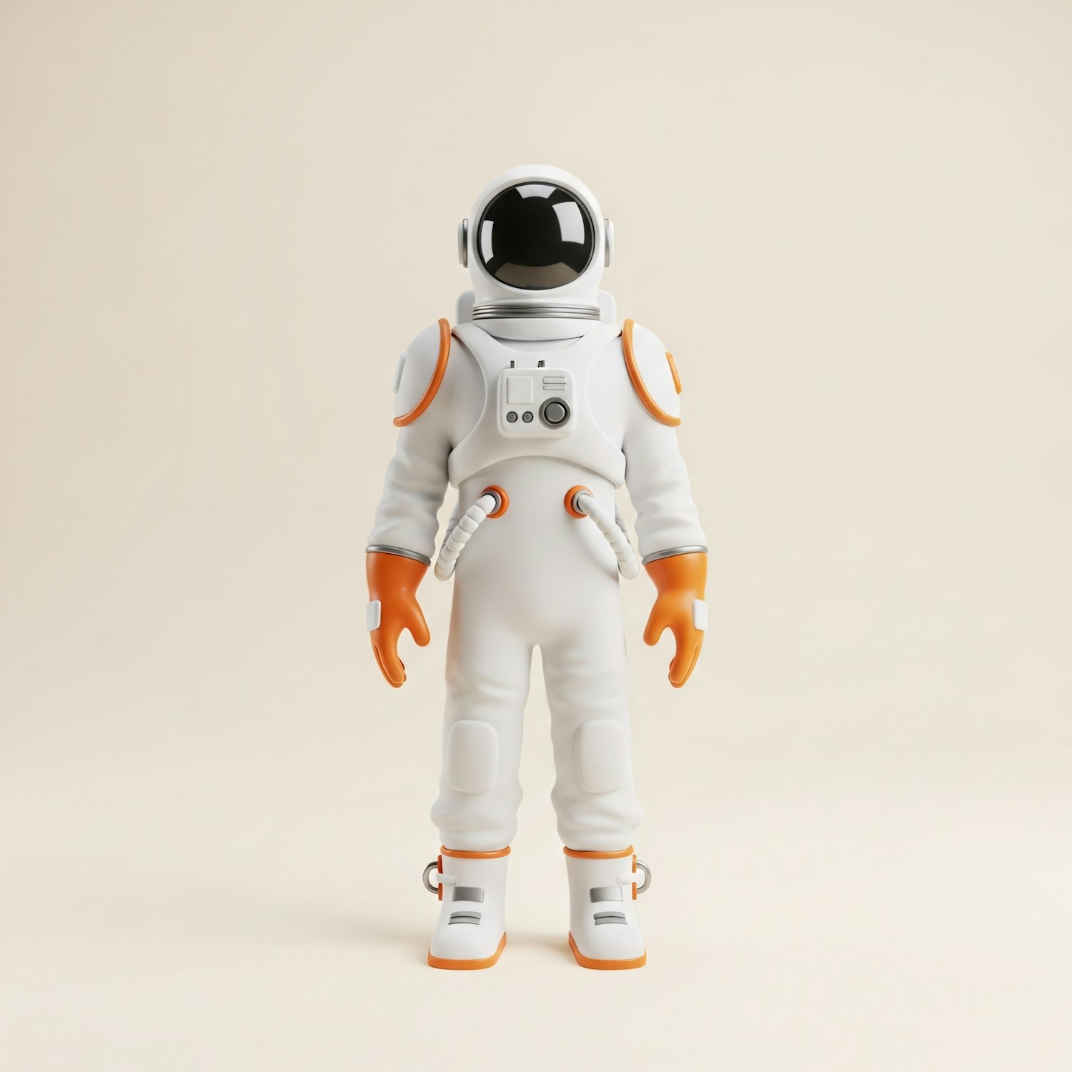 A 3D illustration of a futuristic astronaut in a white and orange spacesuit with a glossy black visor, set against a neutral background.