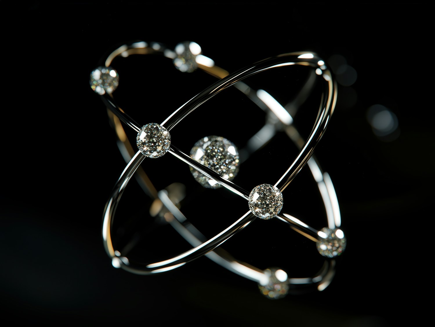 A futuristic 3D rendering of a metallic atom-like structure with diamond-like spheres, set against a sleek black background.