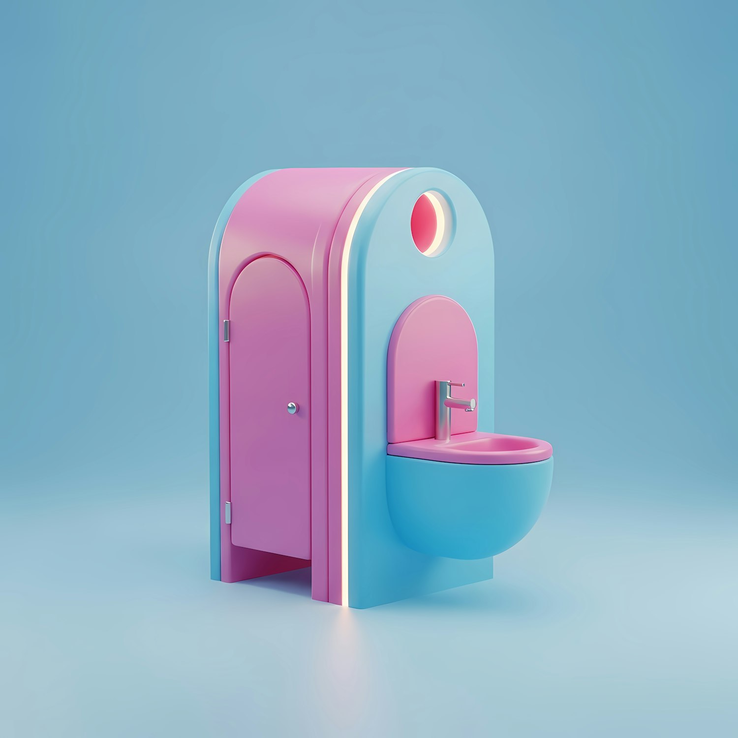 A vibrant 3D-rendered compact bathroom unit in pink and blue, featuring a sink and door, set against a light blue background.