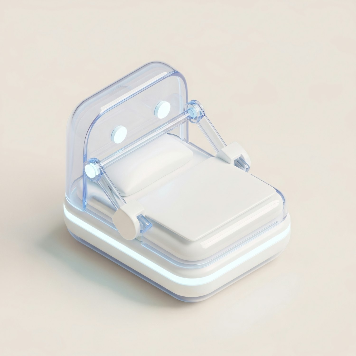 A sleek, futuristic compact bed design with a transparent canopy and glowing accents, set against a neutral beige background.