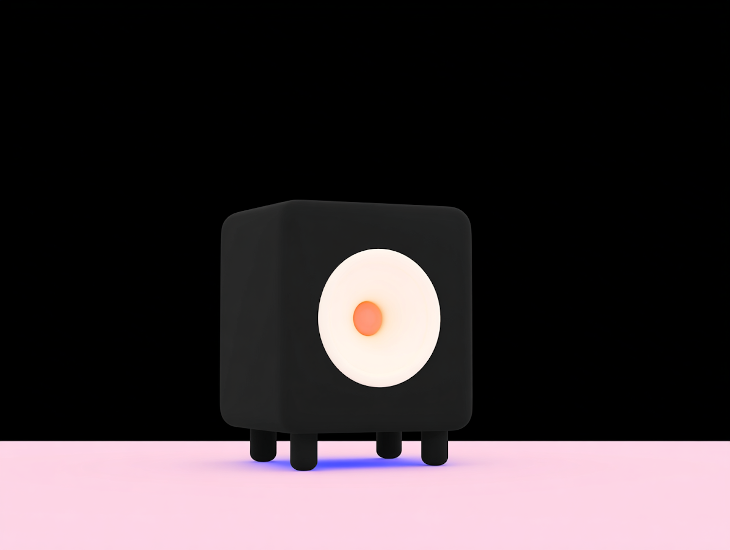 Minimalist black cube with glowing circular design on pink surface, set against a black background. Modern and abstract 3D art.