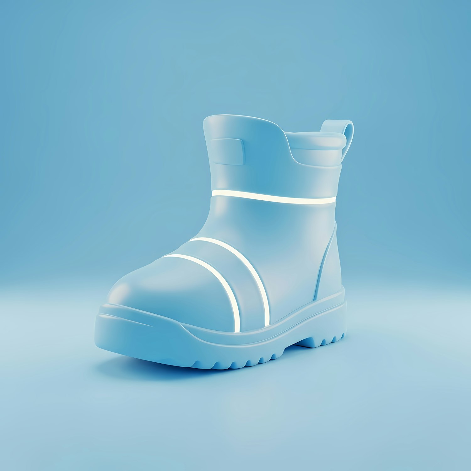 Futuristic blue boot with glowing white accents on a matching blue background, showcasing a sleek and modern design.