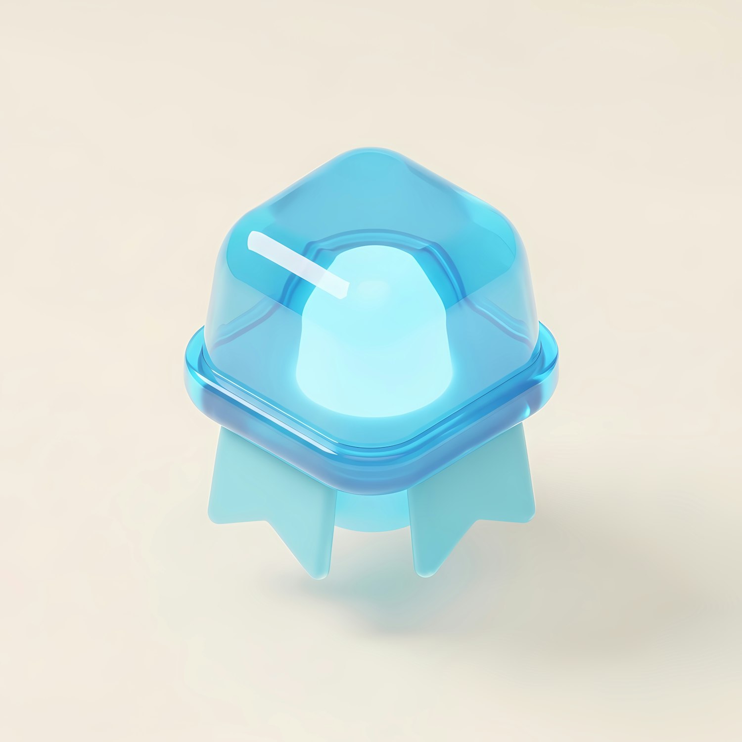 A glowing blue 3D object with a translucent capsule design and a star-shaped base, set against a neutral background.