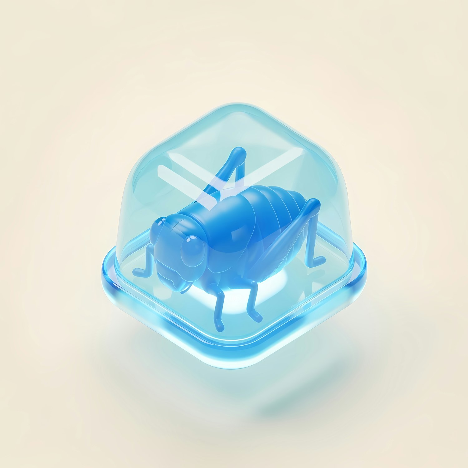 A futuristic 3D rendering of a blue cricket encased in a glowing transparent dome, set against a soft beige background.