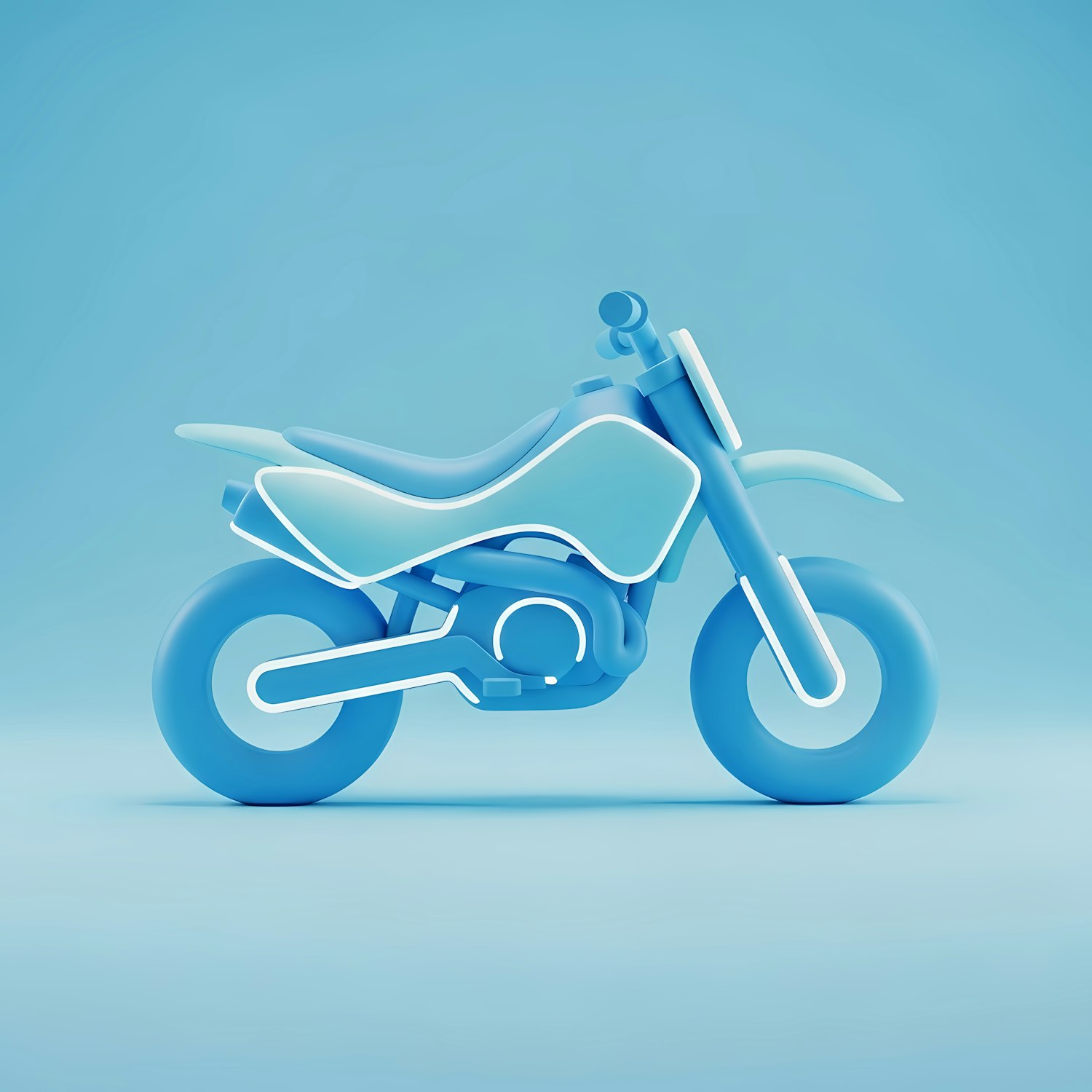Minimalist 3D illustration of a blue motorcycle with glowing white accents on a light blue background. Futuristic and sleek design.