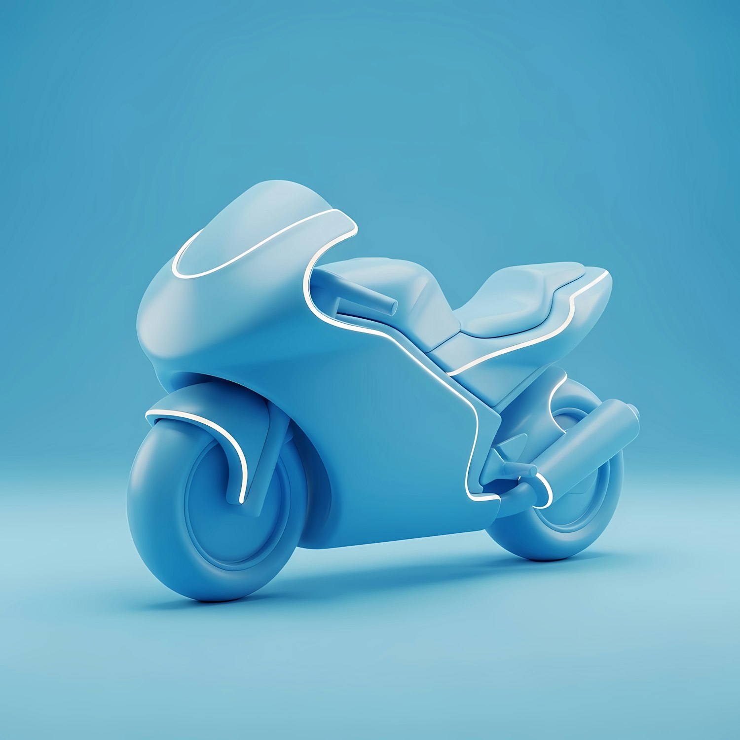Stylized 3D blue motorcycle with a sleek, futuristic design and smooth curves, set against a matching blue background.