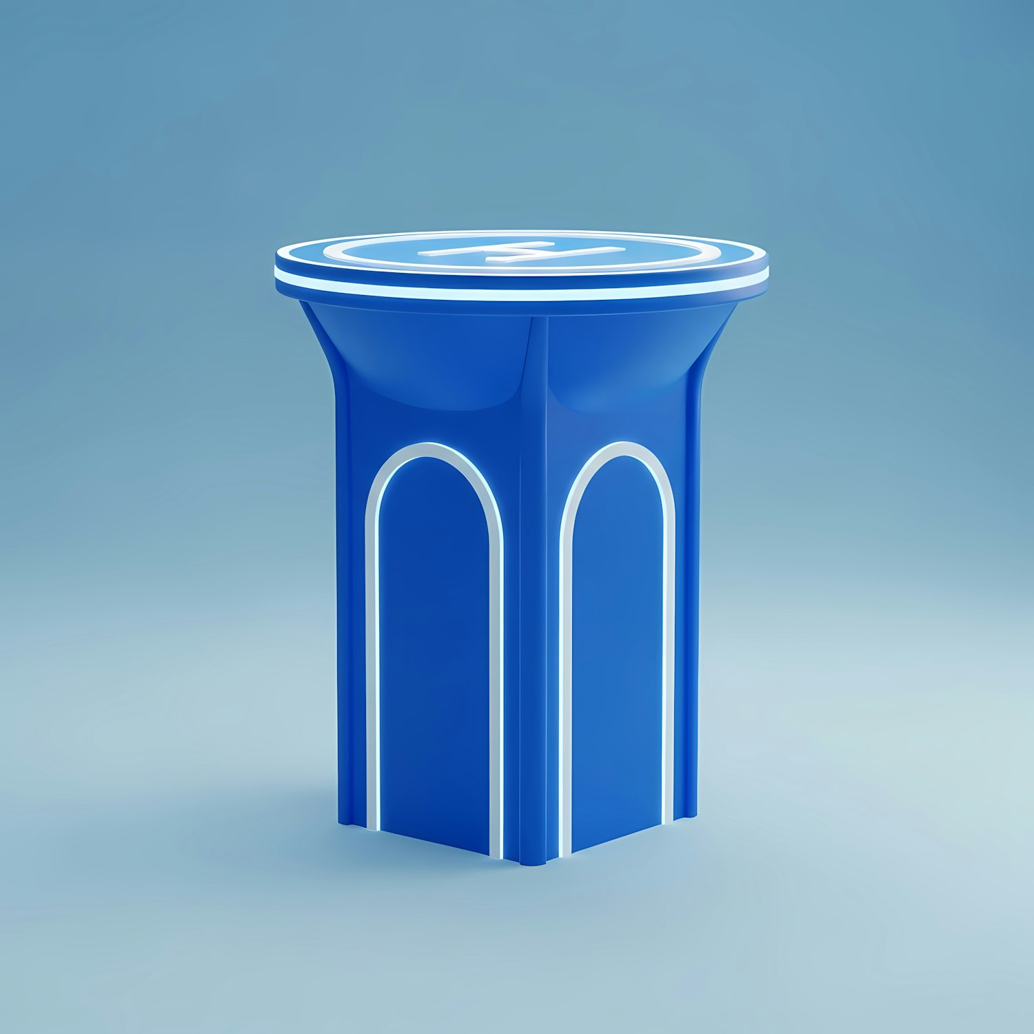 A modern blue pedestal with white accents and a circular top, set against a gradient blue background, showcasing sleek design.