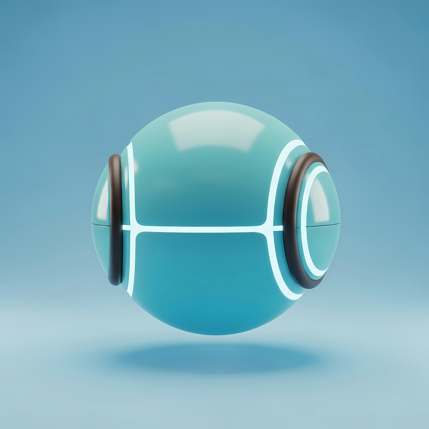 A sleek 3D-rendered blue sphere with glowing white lines and metallic accents, floating against a clean light blue background.