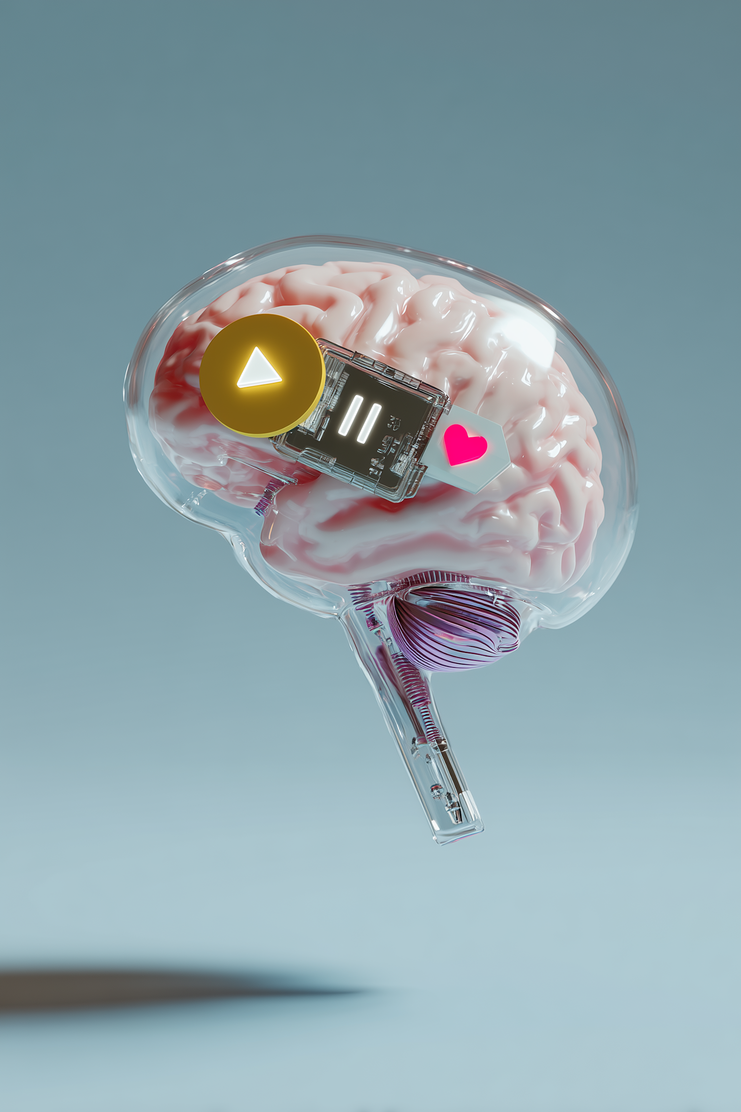 A 3D-rendered brain with digital icons, symbolizing the fusion of technology and human cognition, set against a gradient blue background.