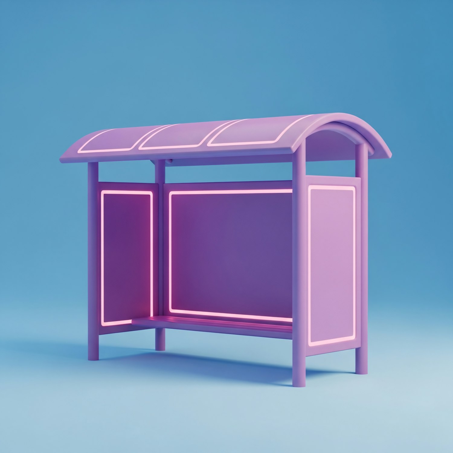 A vibrant 3D-rendered purple bus stop with glowing pink accents against a light blue background, showcasing a modern and minimalistic design.