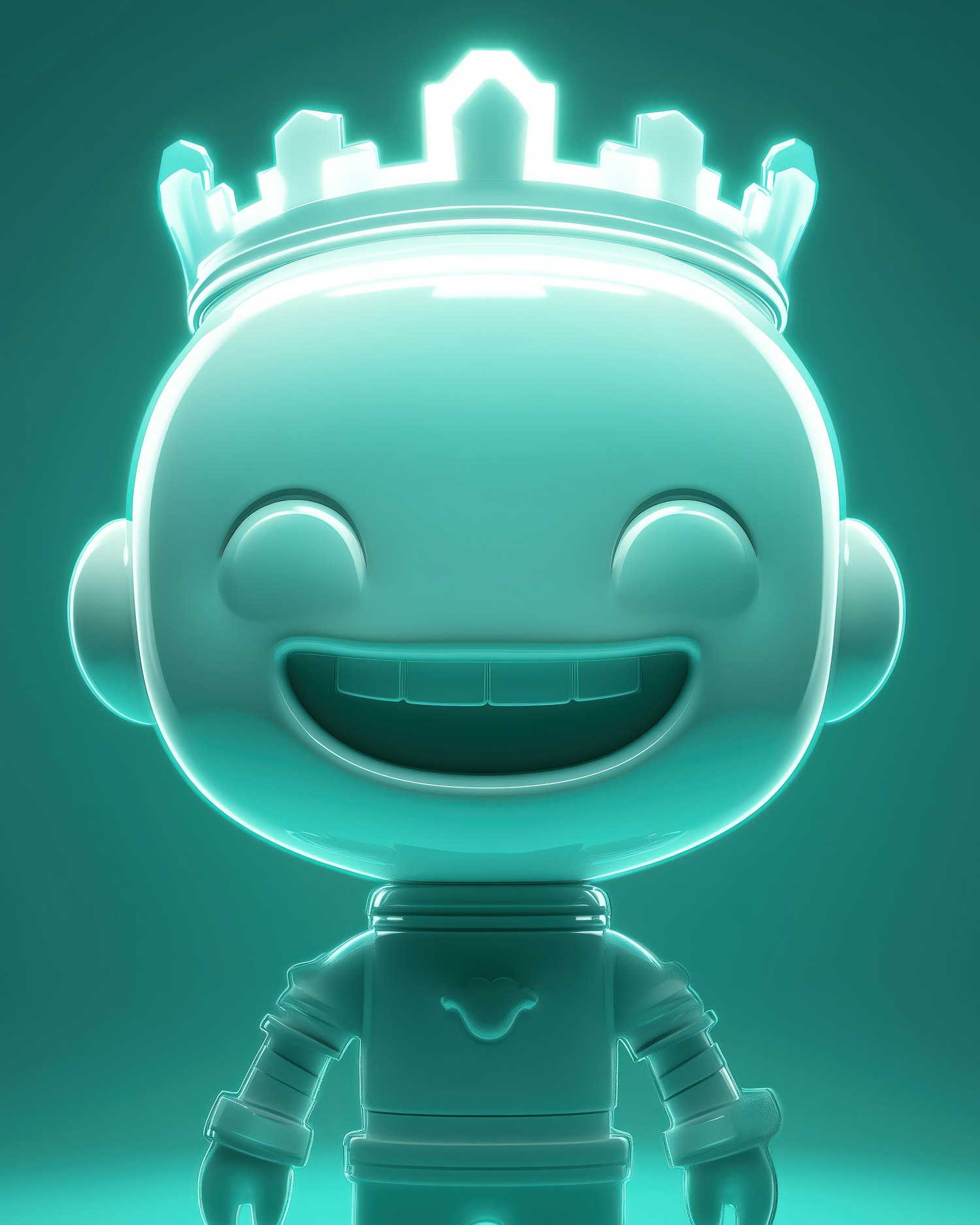 A glowing teal cartoon character with a crown and robotic features, set against a dark teal background for a futuristic vibe.
