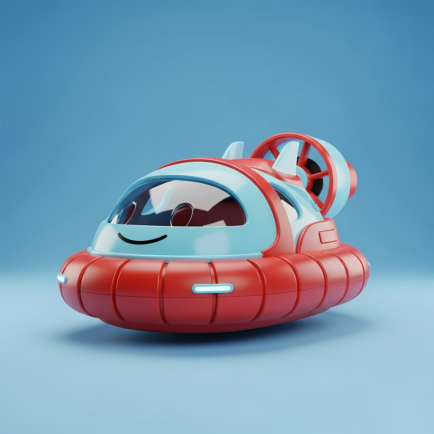 Adorable 3D-rendered red and blue hovercraft with a smiling face, perfect for a playful and futuristic vibe.
