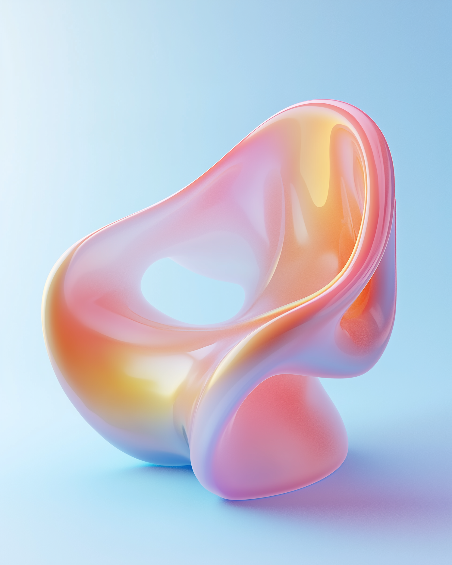 A modern, glossy chair with pastel hues and a fluid, sculptural design set against a soft blue gradient background.