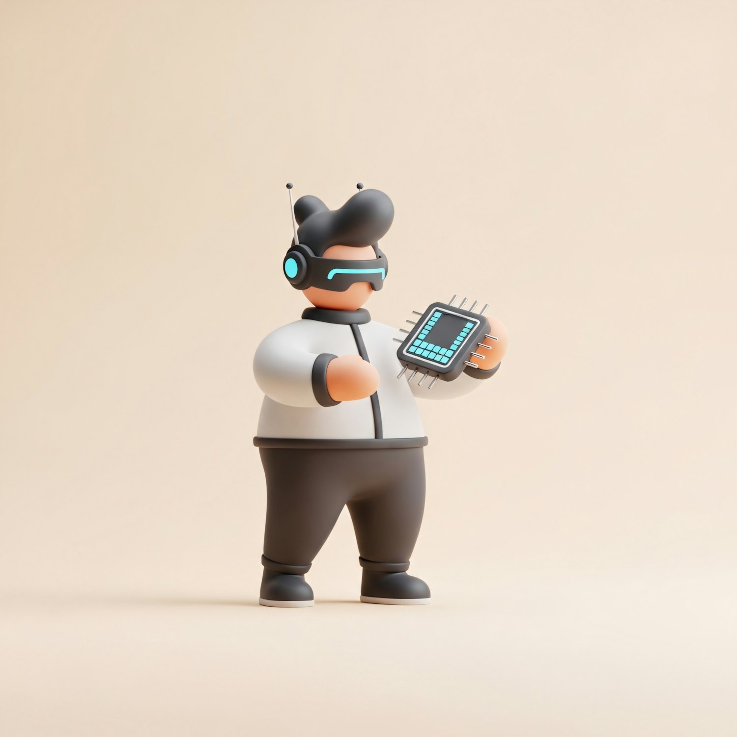 A 3D illustration of a futuristic character holding a glowing microchip, wearing a visor and headset, set against a neutral background.