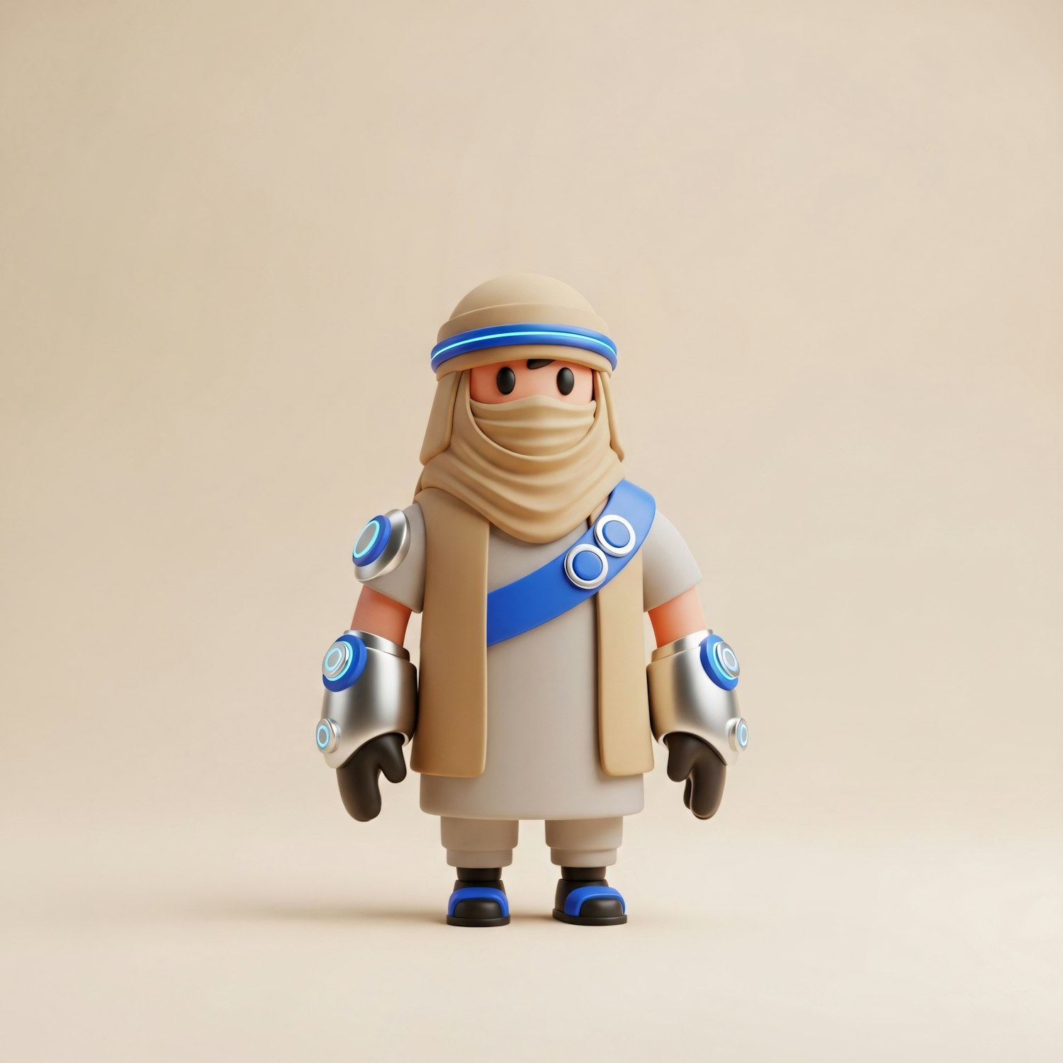 A 3D-rendered character in beige and blue attire with futuristic gauntlets, blending traditional and sci-fi design elements.