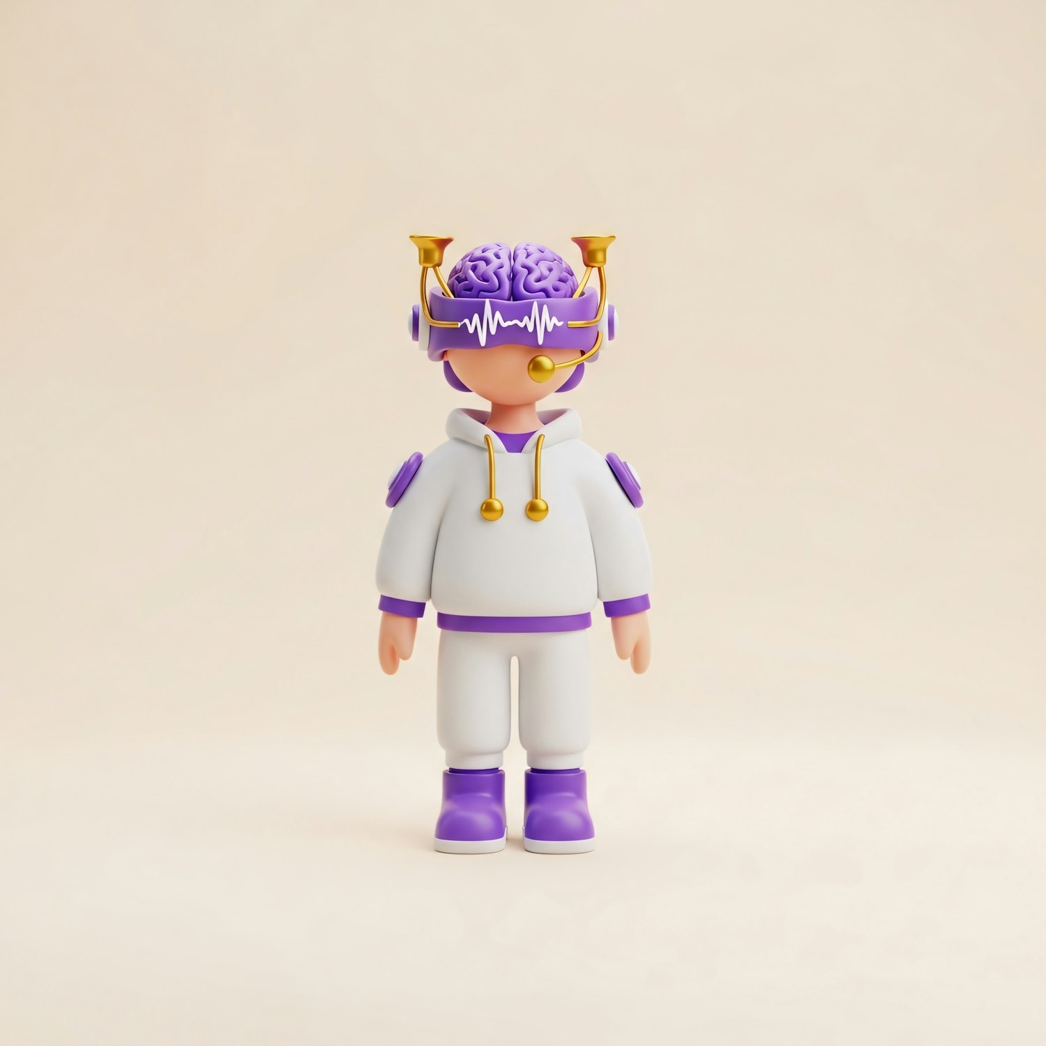 A 3D character in a white and purple outfit with a futuristic brain-themed helmet, set against a neutral background.